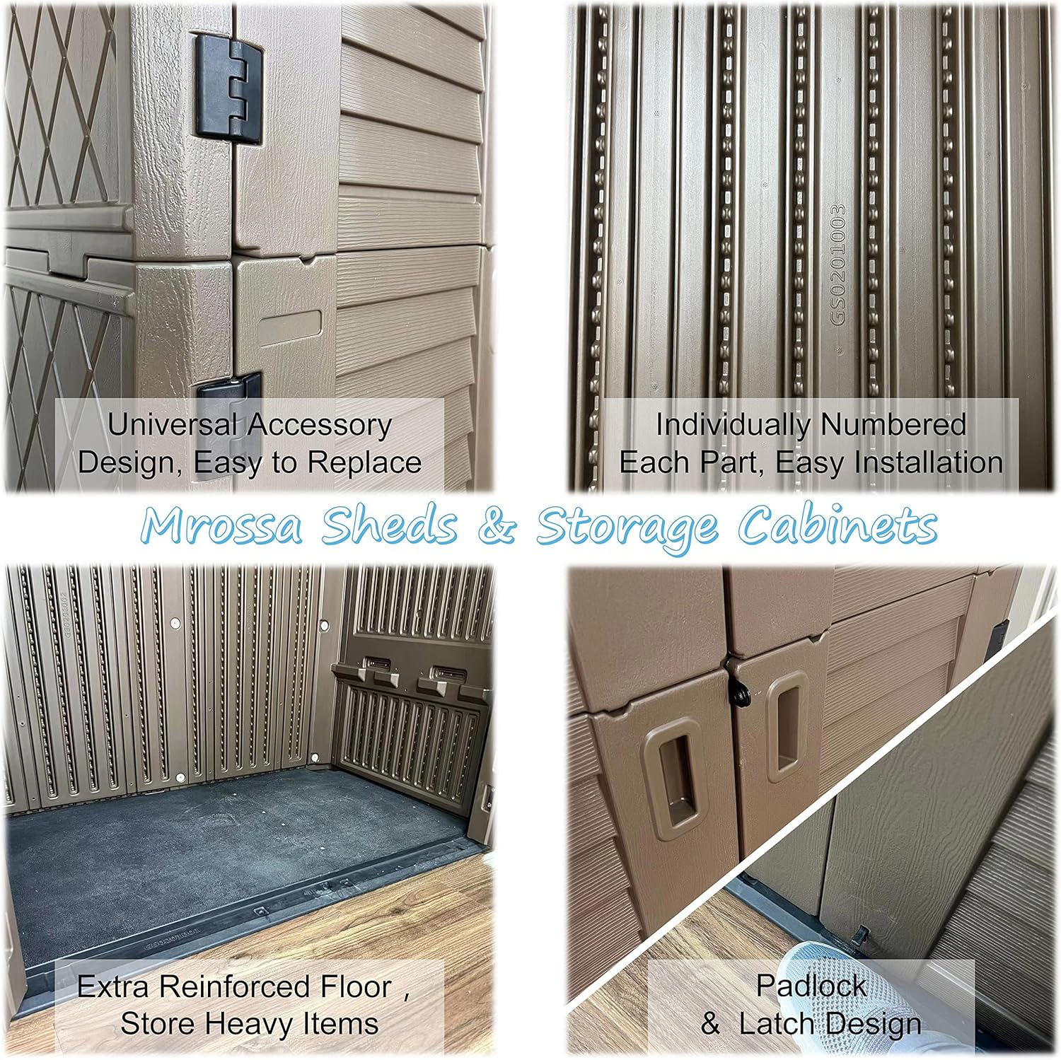 - Detail Design: top groove design helps drainage; lockable; bottom with latch design helps secure door panels; extra shelves help plan storage box space; back with double wall panel design for stronger wind and impact resistance; universal accessory design for easy installation.