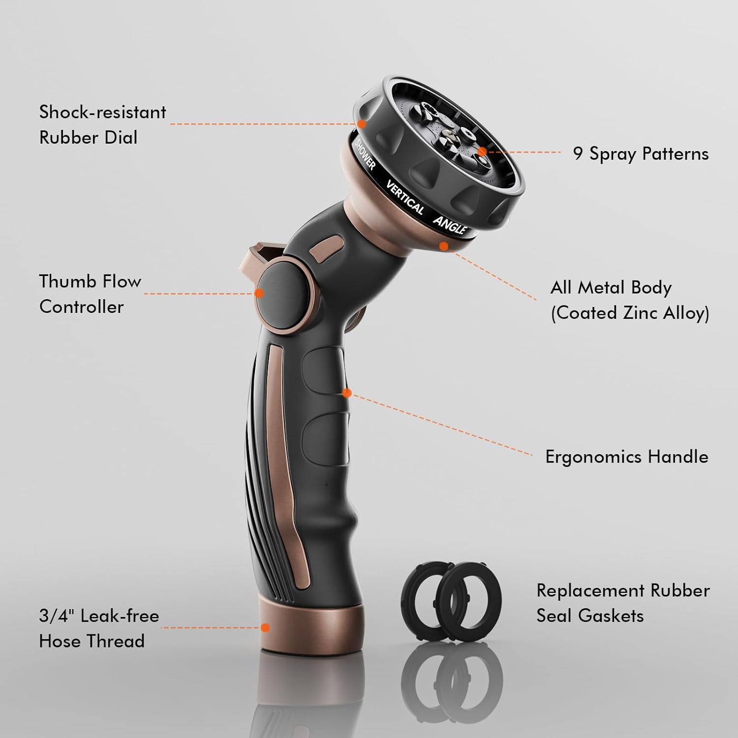 - 【Heavy Duty Metal Hose Nozzle】Constructed with premium zinc-alloy material, this hose nozzle sprayer is solid & strong to resist daily drops and shocks. The bronze powder painting, TPU coating and rubberized bezel dial can enhance durability & flexibility and withstand hard impacts & heavy force. A long-lasting garden hose nozzle you can count on many years.