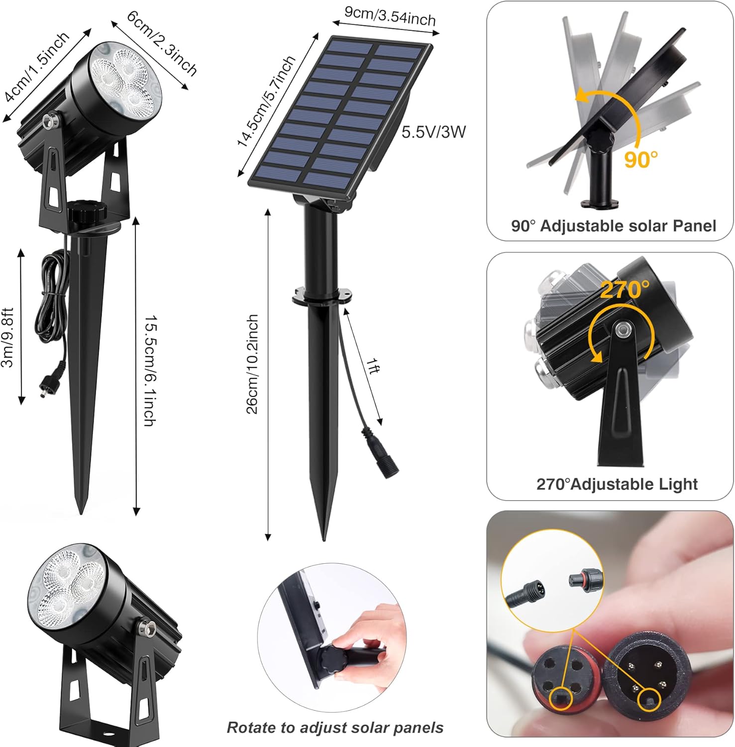 - 2-IN-1 Installation: The solar panel and light can be installed in the ground or mounted on the wall with included screws. Each spot lights with 118inch/3m cable, 180° Adjustable freely up or down to meet different requirements