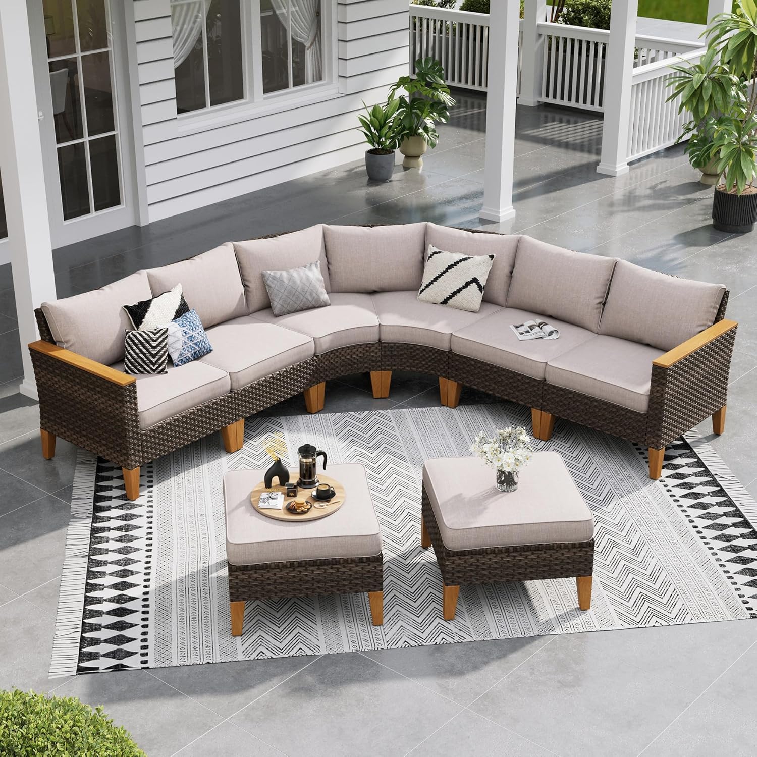 Sophia & William Half Moon Patio Furniture Set 8 Piece Outdoor Sectional Sofa Set, Wicker Patio Conversation Set with 1 Curved Sofa, 2 Armless Chairs, 2 Corner Couch, 2 Ottoman for Deck, Lawn (Beige)