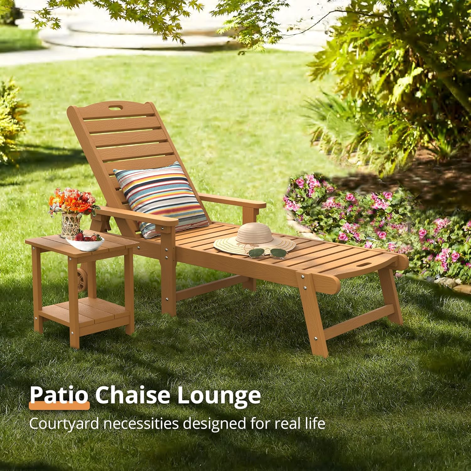 LUE BONA Chaise Lounge Chairs Set with Table, 3-Piece, HDPS Chaise Lounger, 5 Positions Adjustable Lounge Chairs, Pool Lounge Chair with Wheels for Poolside, 3 Year Warranty, Teak Color