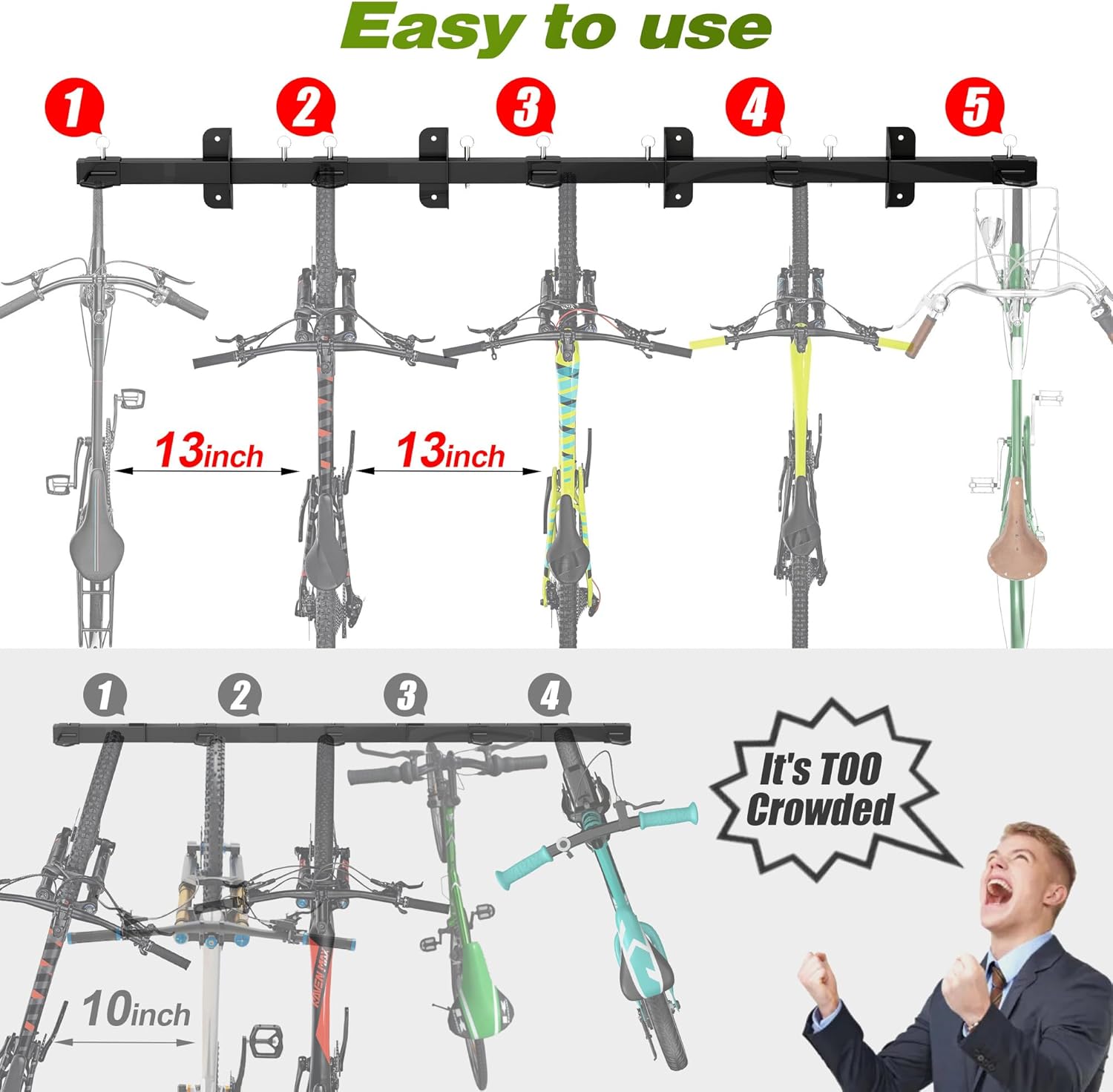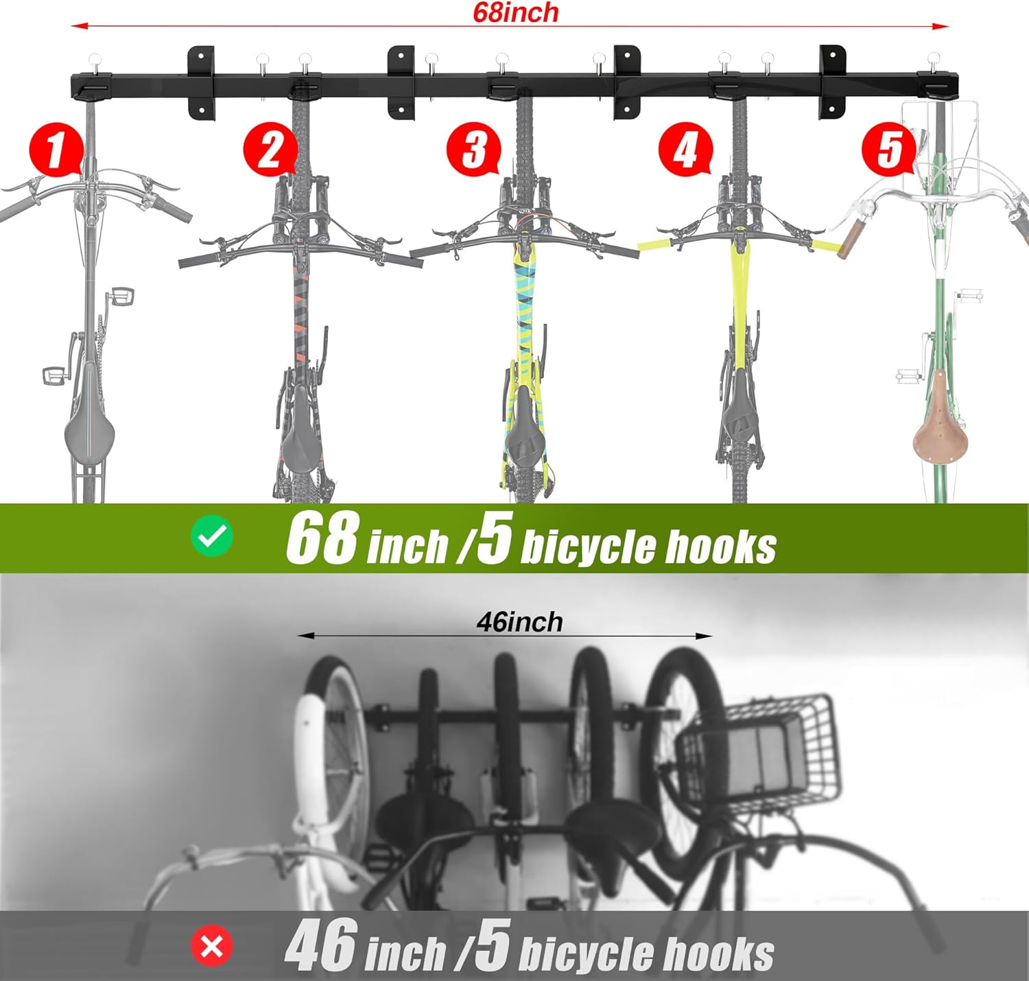 - High Capacity: 68 inches extra-long rails& 5 hooks can be separated or combined to display or hang your bikes. Make the bicycles off the floor to free up some valuable room for your garages, homes. The 16-inch hook spacing allows you to hang 5 bikes perfectly, effectively save space and keep your garage tidy and clean. Our bike storage rack hold fits for most of the bicycles, like road bicycles, folding bicycles, mountain bicycles, adult bicycles, children's bicycles, hybrid bicycles and more.