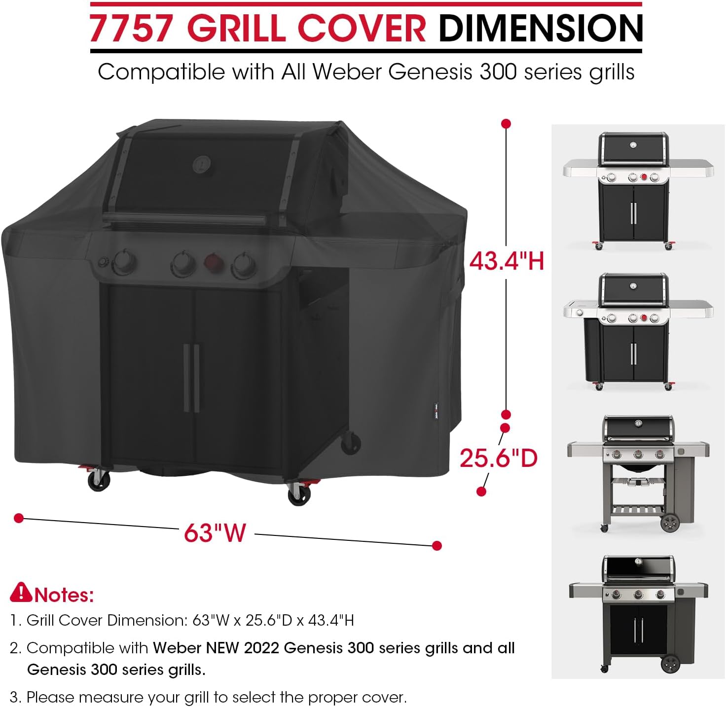 - Grill Cover 63 Inch Dimension: 3-5 burner bbq cover measures 63"W x 25.6"D x 43.4"H, compared to Weber 7757 grill cover, compatible with Weber New 2022 Genesis 300, Genesis II 300 series and all Genesis 3 Burner grills. Also works for other brands of grills with similar sizes up to 61"W, such as Char-Broil, Nexgrill, Napoleon, Broil King and more