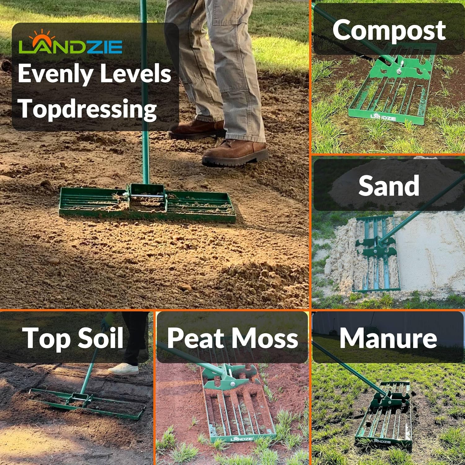 - QUICKLY GET THE JOB DONE: With leveling heads that come in different sizes ranging from 24 inches to as wide as 48 inches, the Landzie Lawn Level Rakes are designed to help you achieve a level and healthy lawn. The extended, 72-inch long handle is designed for maneuverability, easy storage, and comfortable handling of the equipment. USE WITH the Landzie Spreader (B07ZQSV81S) and the Landzie Fork Aerator (B09GCTKWS3) for a lush and level lawn this season