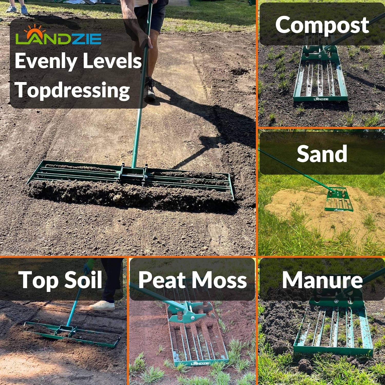 - QUICKLY GET THE JOB DONE: With leveling heads that come in different sizes ranging from 24 inches to as wide as 48 inches, the Landzie Lawn Level Rakes are designed to help you achieve a level and healthy lawn. The extended, 72-inch long handle is designed for maneuverability, easy storage, and comfortable handling of the equipment. USE WITH the Landzie Spreader (B07ZQSV81S) and the Landzie Fork Aerator (B09GCTKWS3) for a lush and level lawn this season.
