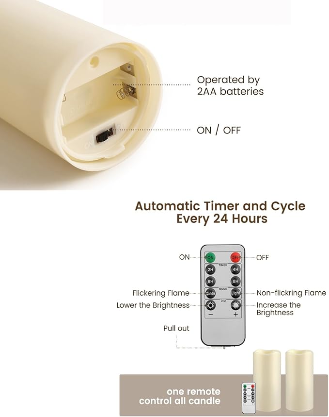 - 10 Button Remote Control - Allows you to display candles in hard to reach places. You can choose between 2/4/6/8 hour timers as well as static blinking light options and brightness levels. The timer loops every 24 hours