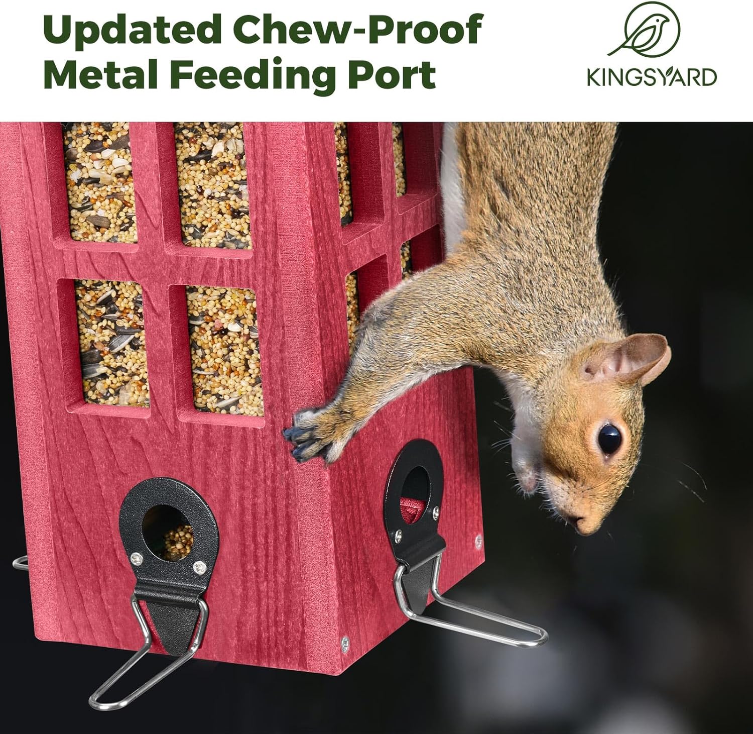 - Steady & Durable: New upgraded metal feeding port to prevent squirrels from gnawing. We have upgraded the plastic feeding ports and perches of the past, to metal, which is stronger and less likely to break. Constructed from high-quality recycled plastic, this birdhouse withstands rain, snow, and sunlight. It resists denting, cracking, and breaking, ensuring long-lasting use throughout the year