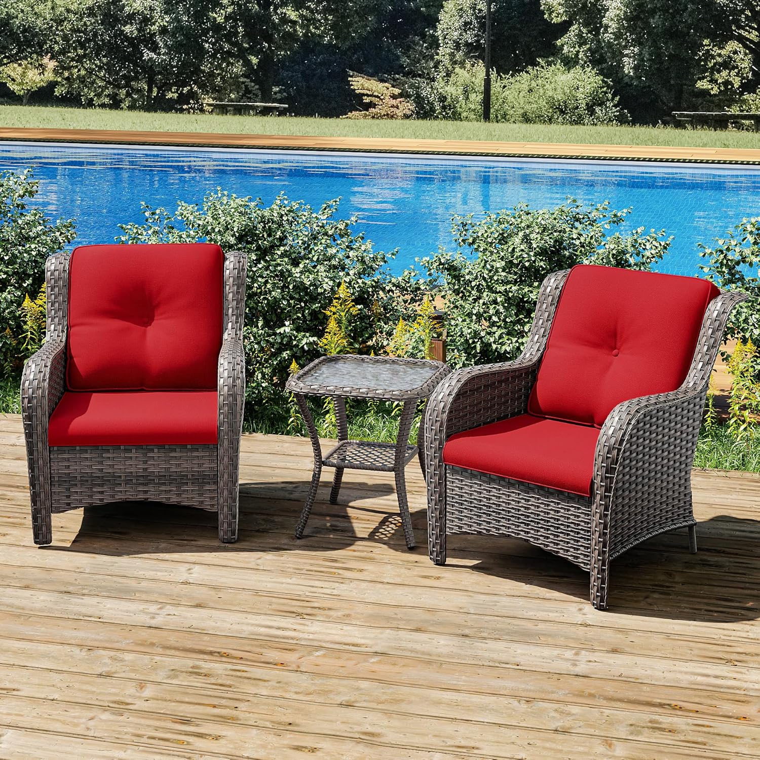 Joyside Patio Bistro Set Wicker Chairs - 3 Piece Outdoor Rattan Conversation Set with 2 Armrest Chair and 1 Side Table for Proch Deck Garden Backyard Balcony(Mixed Grey/Red)