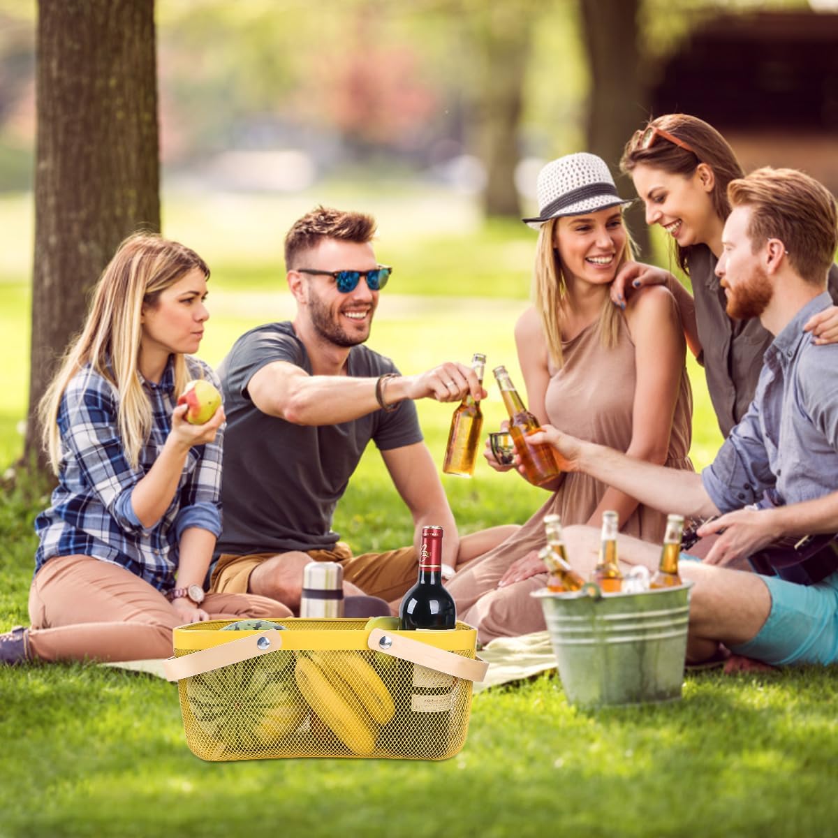 Portable Mesh Harvest Basket - Natural Bamboo Handle Foldable Organizer for Kitchen, Garden & Picnic | Ventilated Storage Bin with Rust-Proof Wire, Space-Saving Farmhouse Decor (Lemon Yellow)