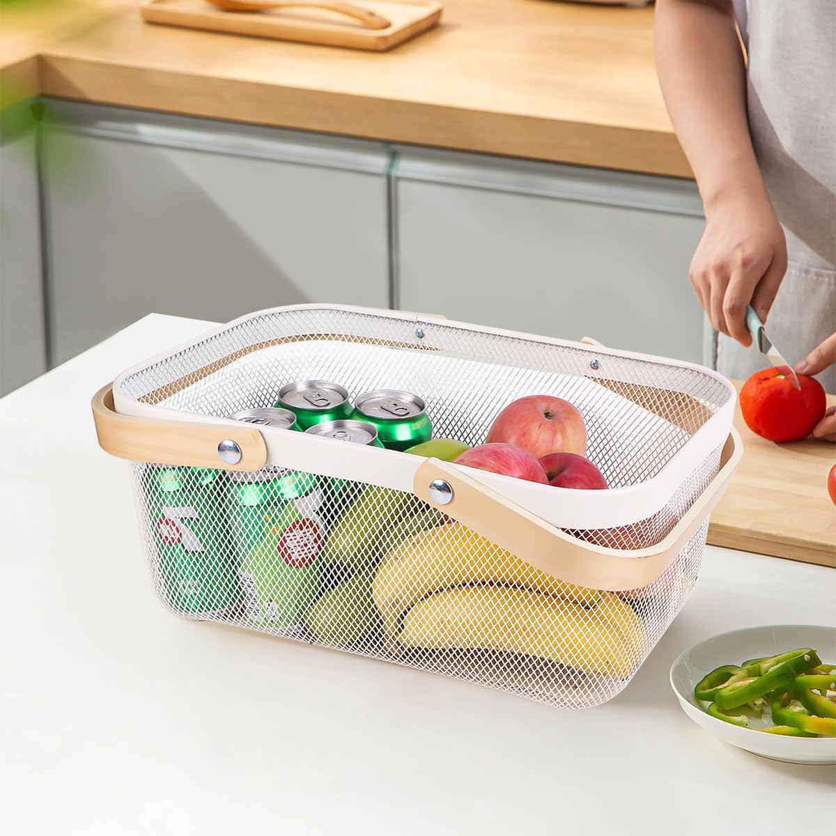 Portable Mesh Harvest Basket - Natural Bamboo Handle Foldable Organizer for Kitchen, Garden & Picnic | Ventilated Storage Bin with Rust-Proof Wire, Space-Saving Farmhouse Decor (White)