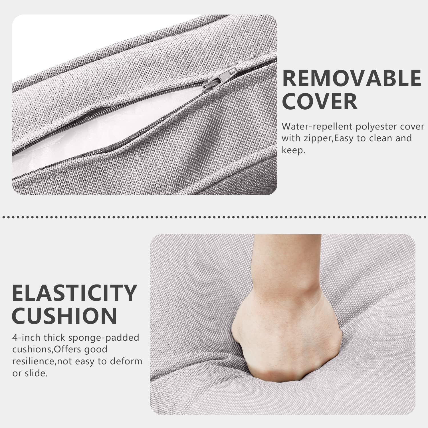 - 【Comfortable 4'' Thick Cushions】This garden furniture set features deep and wide seats with 4-inch thick sponge-padded cushions.Offers good resilience, not easy to deform or slide, also protect your lumbar and offer a comfortable sitting experience,Water-repellent polyester cover with zipper,Easy to clean and keep.