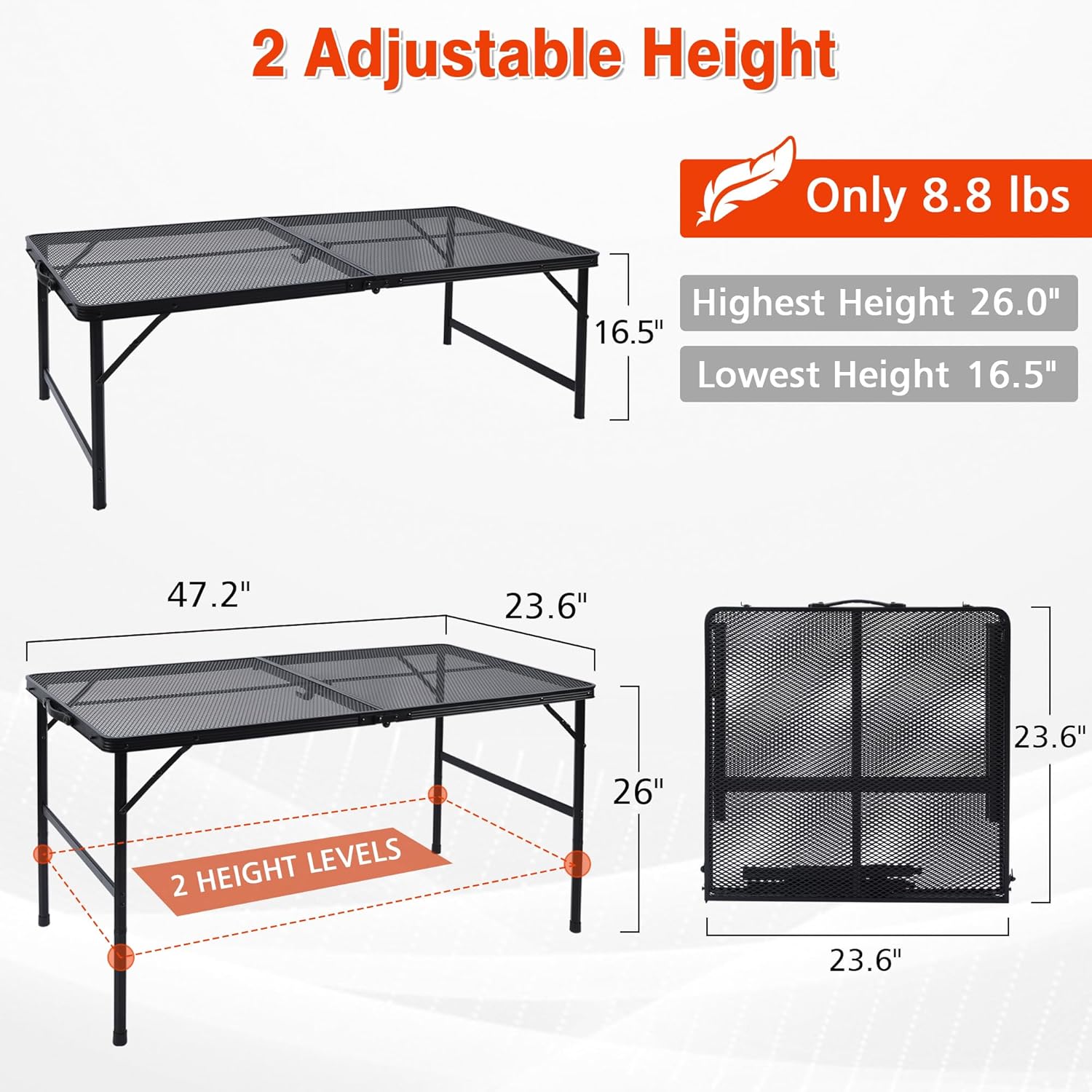 Folding Grill Table, 4x2 FT Portable Camping Table, Lightweight Height Adjustable Metal Tables with Mesh Desktop and Mesh Bag, Outdoor Tables for Camping, Picnic, Beach and BBQ, Black