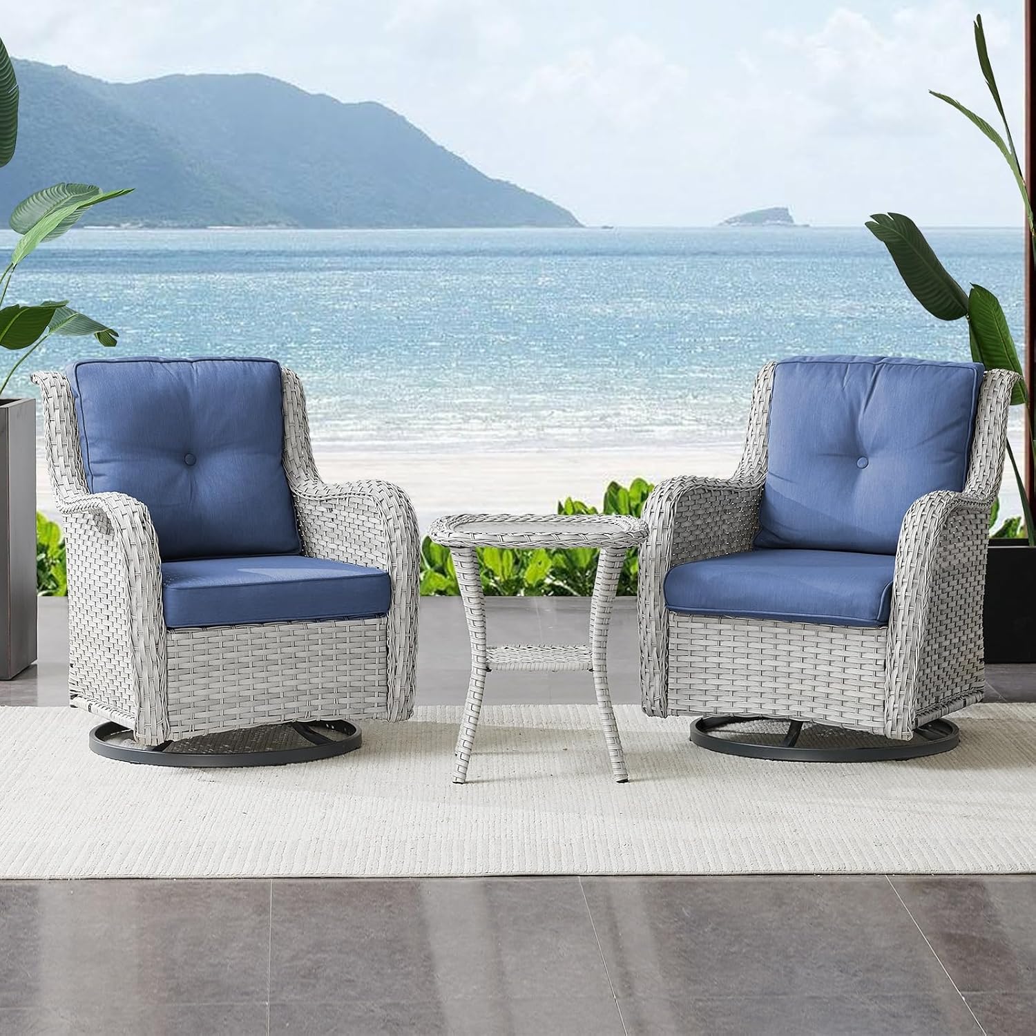 - 1.Outdoor Swivel Rocker Set: This high back patio swivel rocker chair, made of iron alloy frame and high quality PE resin wicker. The broad armrests is very smooth and chair base frame have a rust-resistant coating, and the upscale minimalist style is sure to be the highlight of your outdoor space. Perfect for indoor and outdoor use, such as patio, porch, backyard, balcony, poolside, garden and other outdoor spaces, easily meet your needs for the purpose of decorating your leisure place.