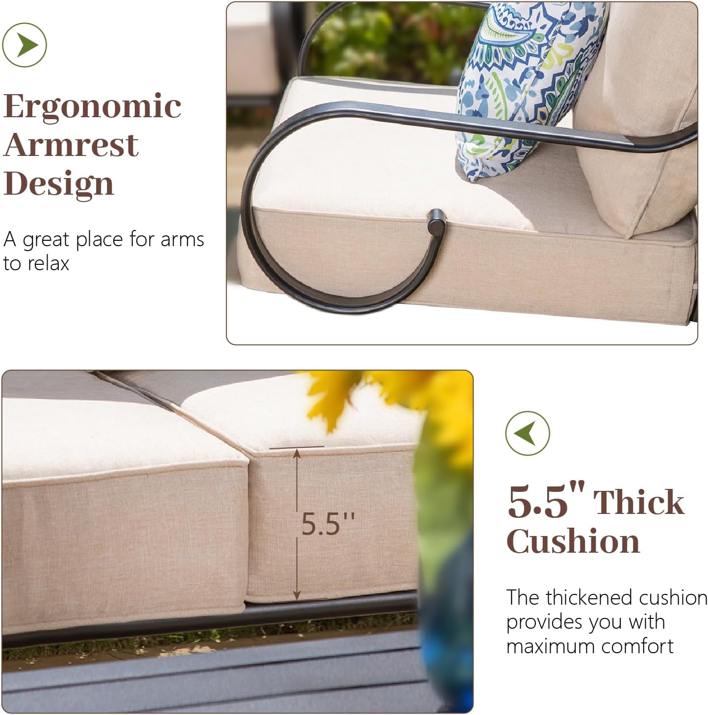 - 5.5 Inch Seat Cushion: Our patio conversation set is equipped with a 5.5-inch thick cushion (thick than 4.2 inches on the market), which is made of top-grade Olefin fabric, breathable and waterproof. The interior is filled with high-quality resilience and high density sponge, with excellent support and flexibility. Cushions are designed with zippers, convenient to be replaced and cleaned