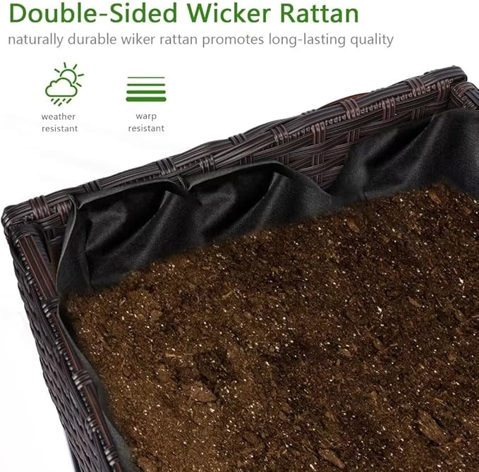- {Double-sided simulated Rattan Material} The material of the raised garden bed is simulated rattan, and it is double-sided, different from the single-sided on the market, with a smooth surface and no burrs. The bottom shelf provides extra storage space for garden tools, keeping tools and small flowerpots handy.