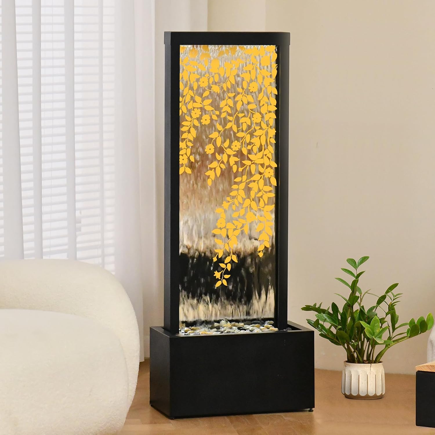 - WATER FEATURES DESIGN: This Fountain with leaves in the transparent water and river stone,appear very vivid as if in nature for living Room deck outside garden porch and lawn.