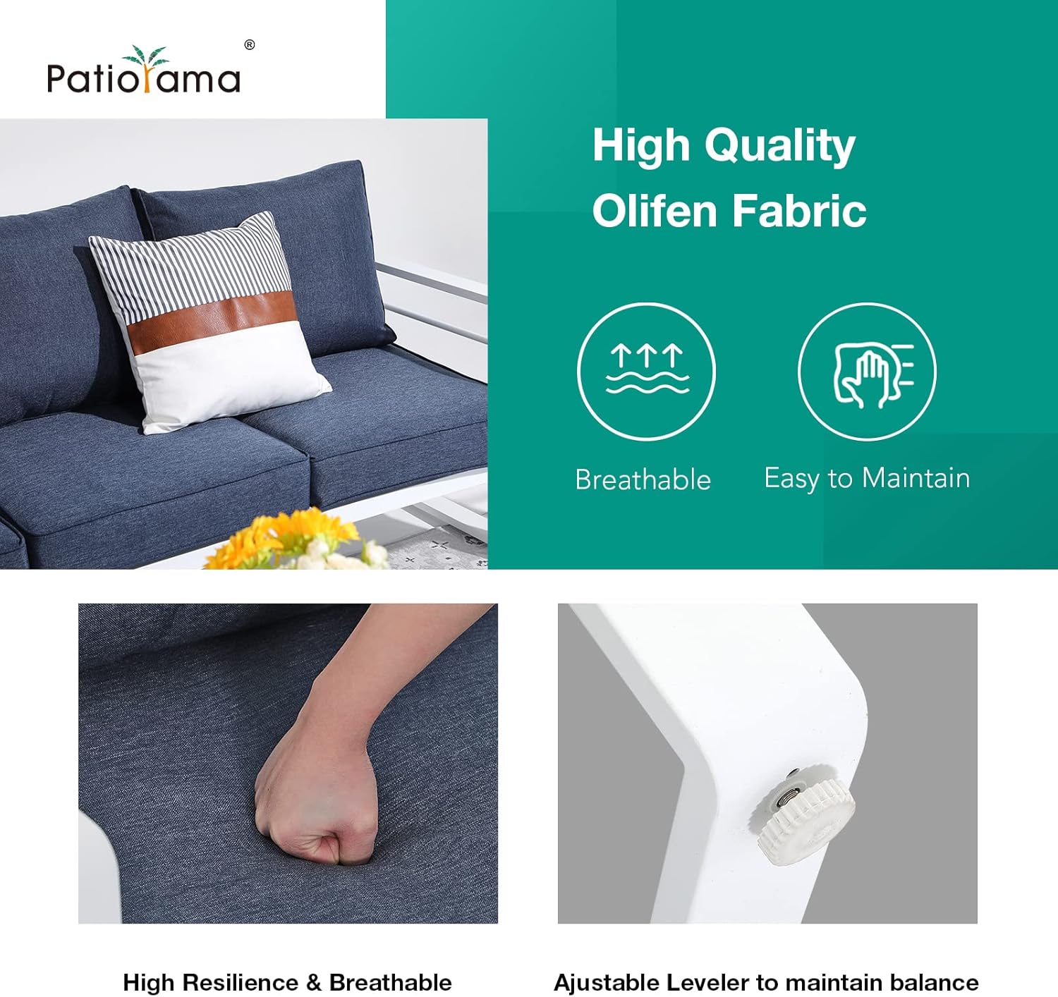 Patiorama Aluminum Patio Furniture Set, Outdoor Patio Loveseat, 2 Seat Sofa Couch, All Weather White Metal Chair with Olefin Cushion, Deep Seating, 600 lbs Capacity, Deck, Garden-Blue Cushion