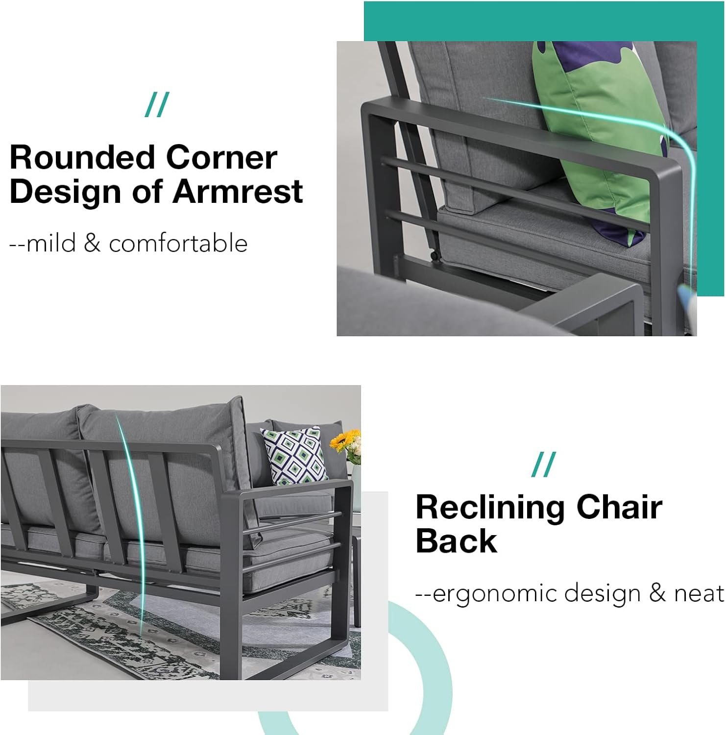 - [Designed for Comfort and Style]: Abandoning the conventional styles, the exterior design of the aluminum outdoor couch is created by the leading group. Engineered with ample and reclining back support for maximum comfort. The unique open and round-corner design for armrests with 2 round tubes on the sofas gives the outdoor 3-seater sofa an airy and mild silhouette. Rounded corner legs are adjustable to level on any type of surface.