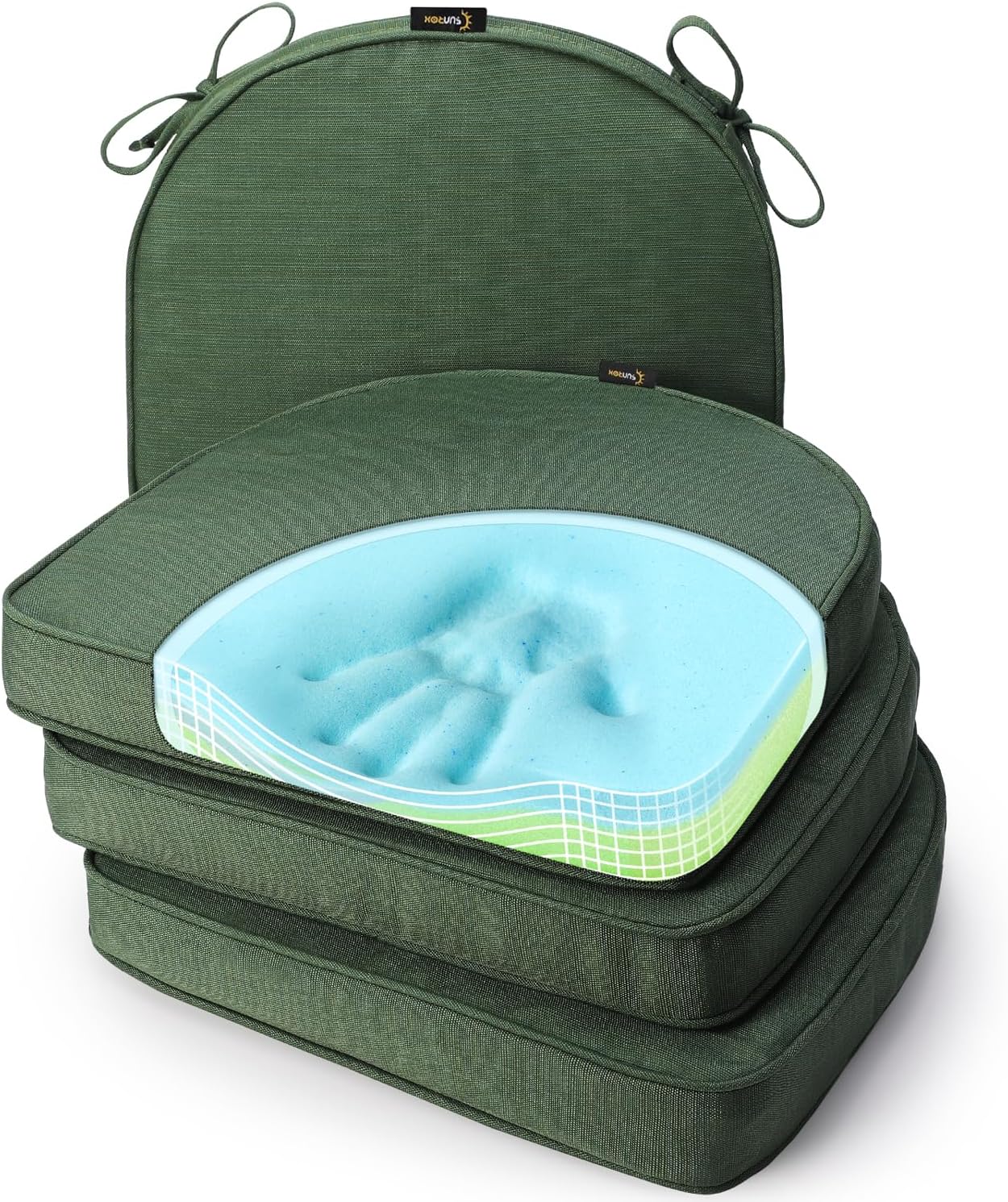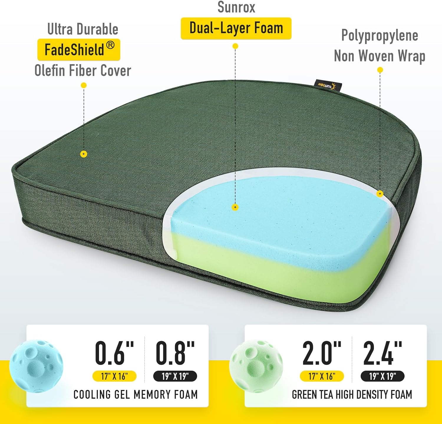 SUNROX Gel Memory Foam Chair Cushions, FadeShield Water-, Stain-Resistant Durable Reversible Seat Cushion Pads with Ties for Indoor/Outdoor Kitchen Dining Office, 19"x19", Set of 4, Heather Fern