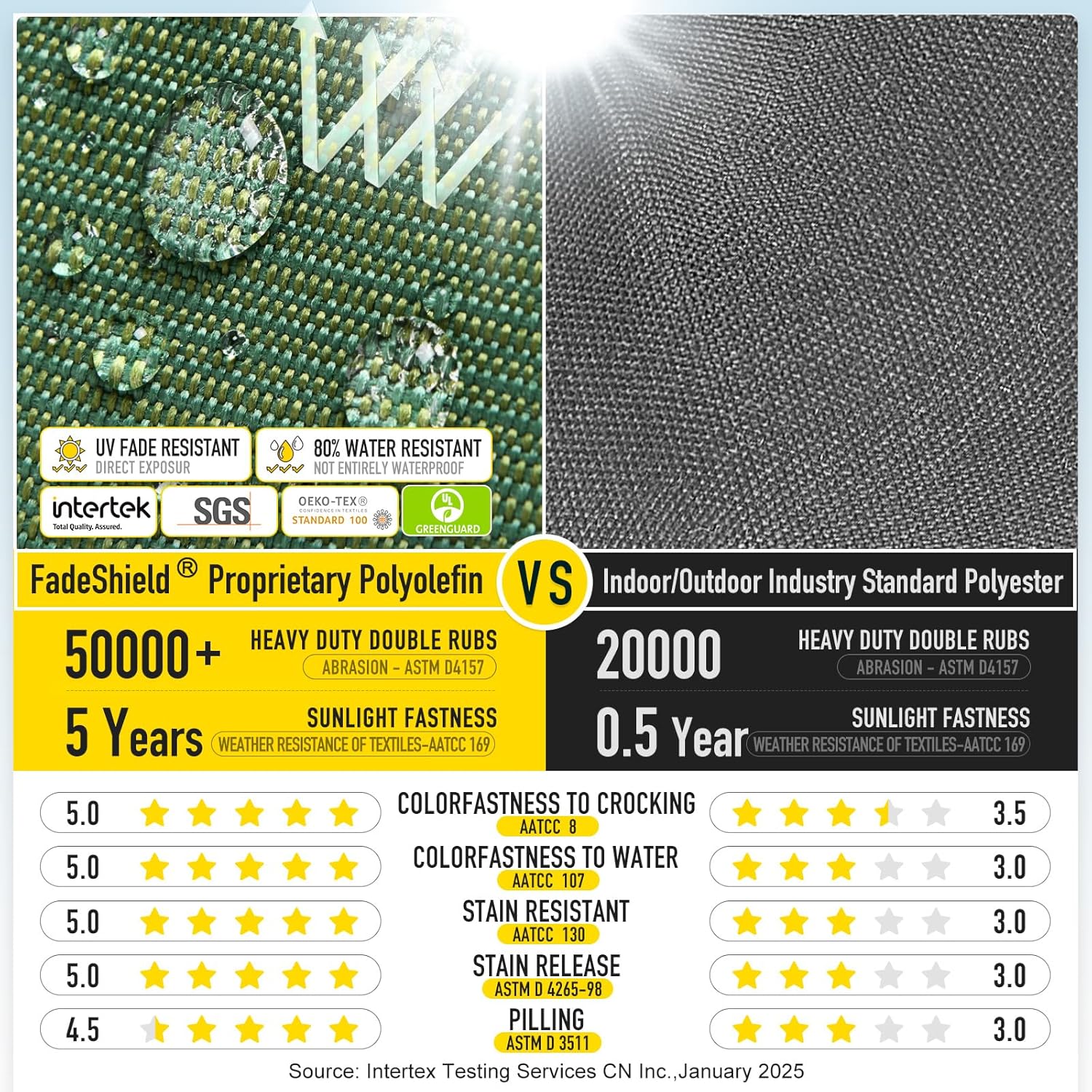 - 【FadeShield - UV Fade Resistant】FadeShield Proprietary Polyolefin are dependable indoor/outdoor performance fabrics, they are infused with antimiсrоbial silver Ion technology and can withstand 5 years of UV fade resistance, solution-dyed to make sure that each color is deeply ingrained in every fiber for continued vibrancy, even after heavy use. We recommend bringing it indoors when it rains or when not in use to preserve its lifespan and keep it looking beautiful.
