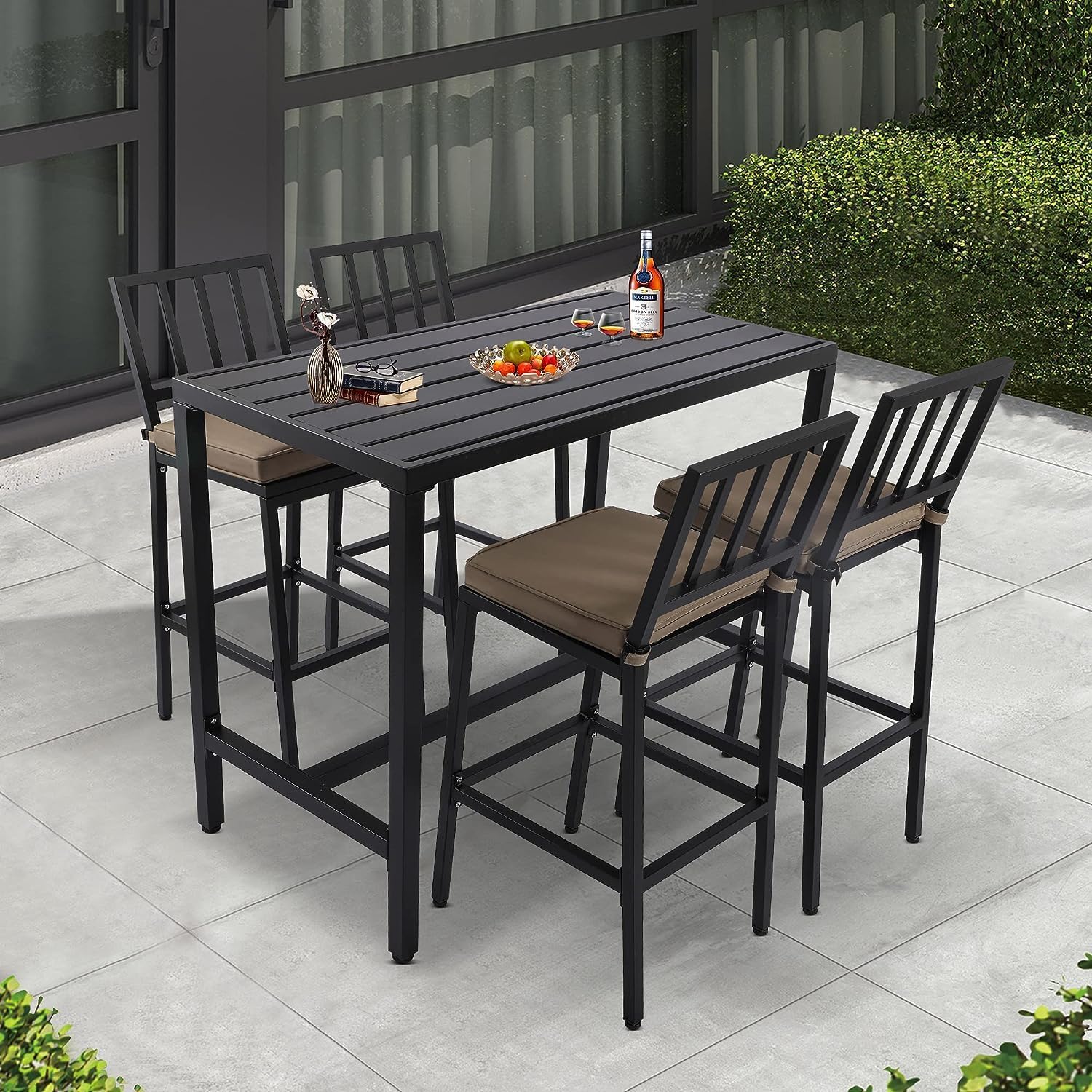 - 5-Piece Patio Bar Set: This 5-piece patio bar set includes 1 bar table and 4 bar stools is simple but sylish which could integrated with various decorations and scenes perfectly. It is a perfect choice for you to have a conversation, drink, enjoy leisure time with your families or friends