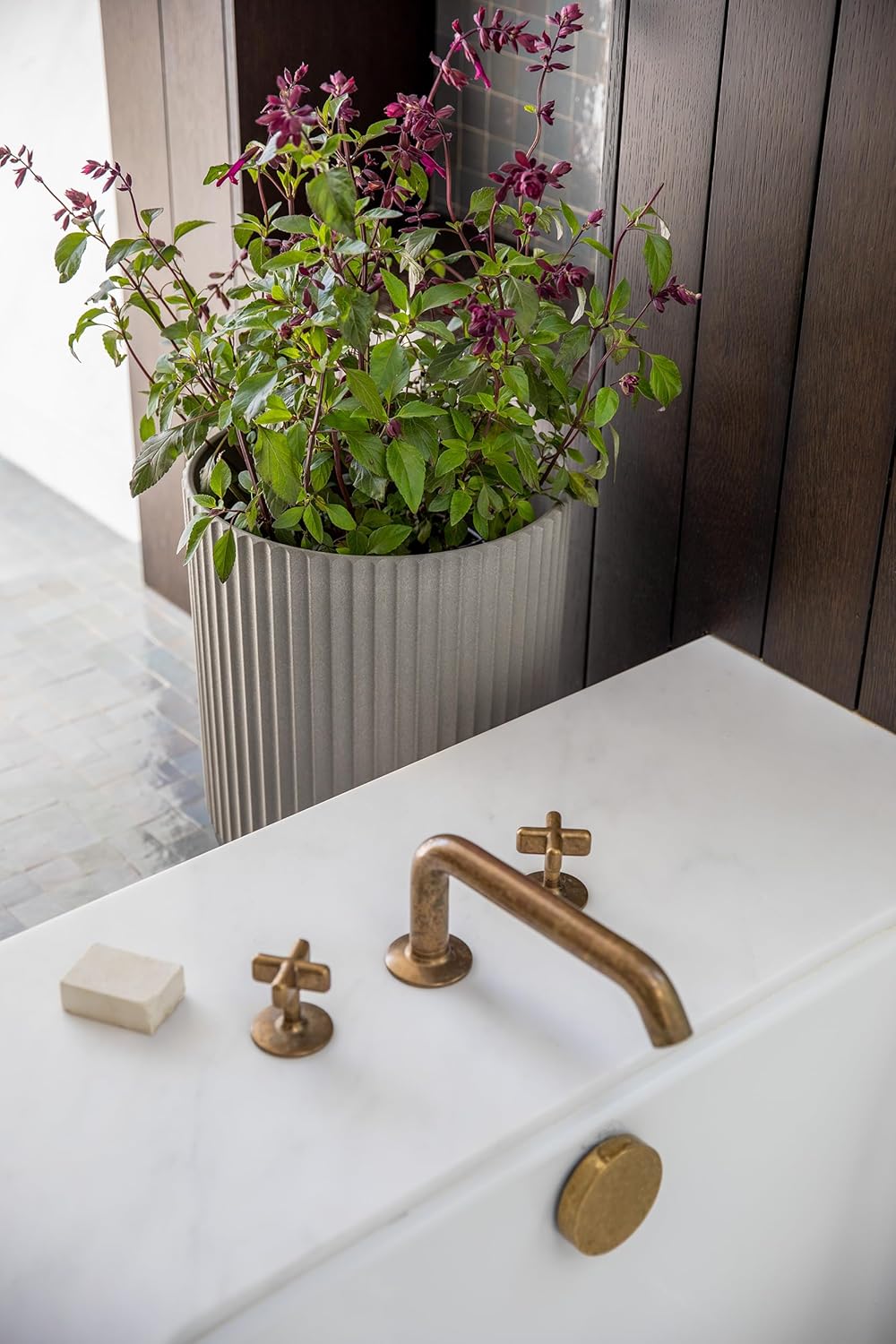Veradek Demi Series Round Planter w/Stand for Porch/Patio | Durable Plastic-Stone Composite & Wooden Stand | Modern Décor for Tall Plants, Flowers