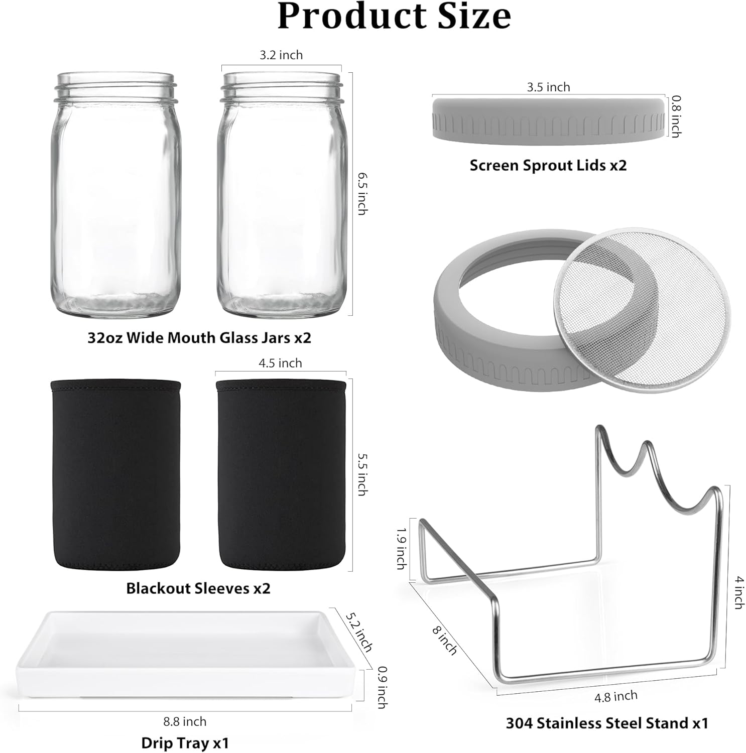 - COMPLETE SPROUTING KIT - Includes 2 Glass jars, 2 screen sprout lids, 1 stainless steel stand, 1 drip tray, 2 blackout sleeves.(SEED NOT INCLUDED)