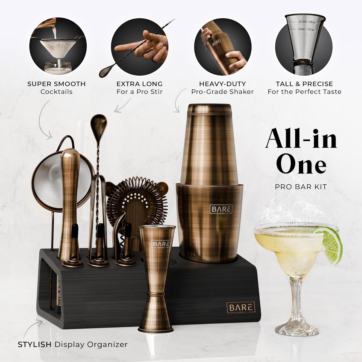 - Included Components : 28oz Boston Shaker, Japanese Jigger, Hawthorne Strainer, Fine Mesh Strainer, Muddler, Corkscrew Bottle Opener, 3 Liquor Pourers, Liquor Cleaner Brush, Ice tongs, Mixing Spoon, Bamboo Organizer Stand, 35 Recipe Cards, Brass Color Tools with a Black Color Stand 28oz Boston Shaker, Japanese Jigger, Hawthorne Strainer, Fine Mesh Strainer, Muddler, Corkscrew Bottle Opener, 3 Liquor Pourers, Liquor Cleaner Brush, Ice tongs, Mixing S… See more