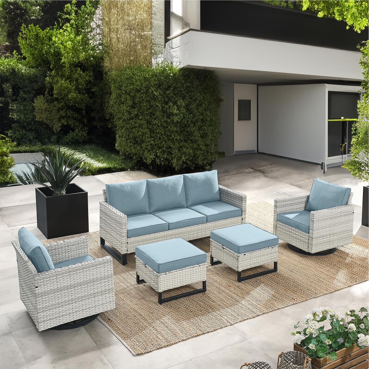 HUMMUH Patio Furniture Set 5 Piece Outdoor Sectional Sofa,PE Wicker Patio Swivel Rocker Chairs with Ottomans for Porch,Garden,Backyard