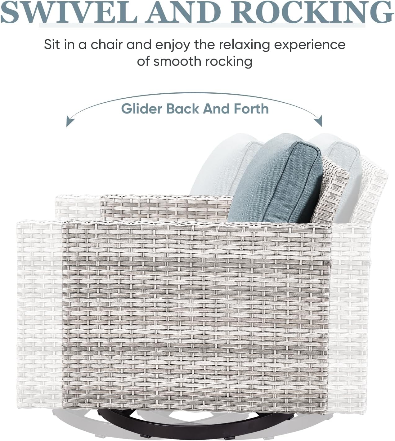 - 【360°Swivel Glider Rocker Chairs】Design of rotating 360 degree,swinging back and forth,You can easily turn your face away from the sun without moving the entire chair, or swing your seat like a cradle for the ultimate relaxation while listening to music or watching your children play outside.