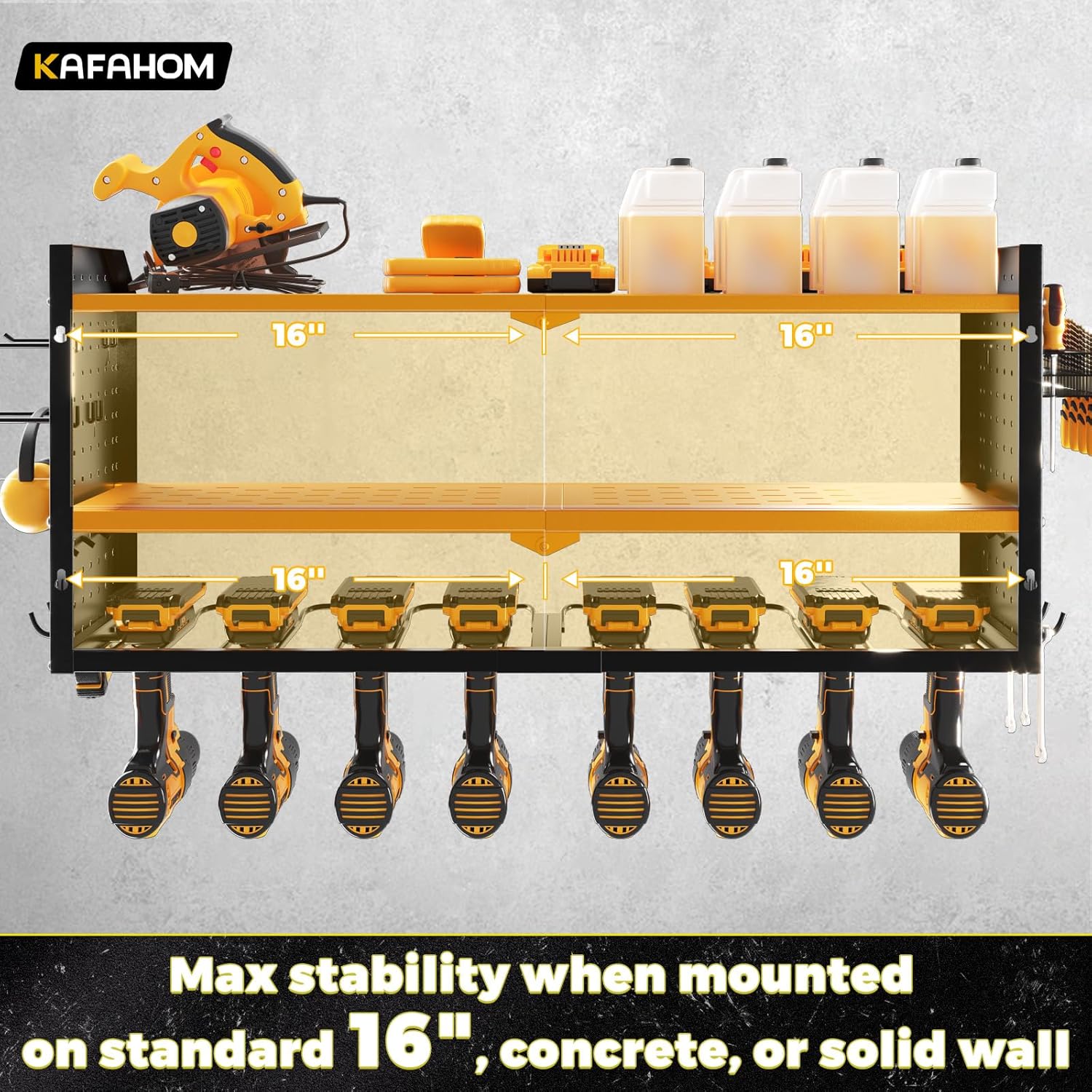 - Easy Installation: KAFAHOM garage wall shelving schieve maximum stability with a straightforward installation process. Whether you're mounting it on a wooden wall, concrete surface, or pegboard, this tool rack wall mount is designed for easy and secure attachment.Amazing christmas or father's day gift for men.