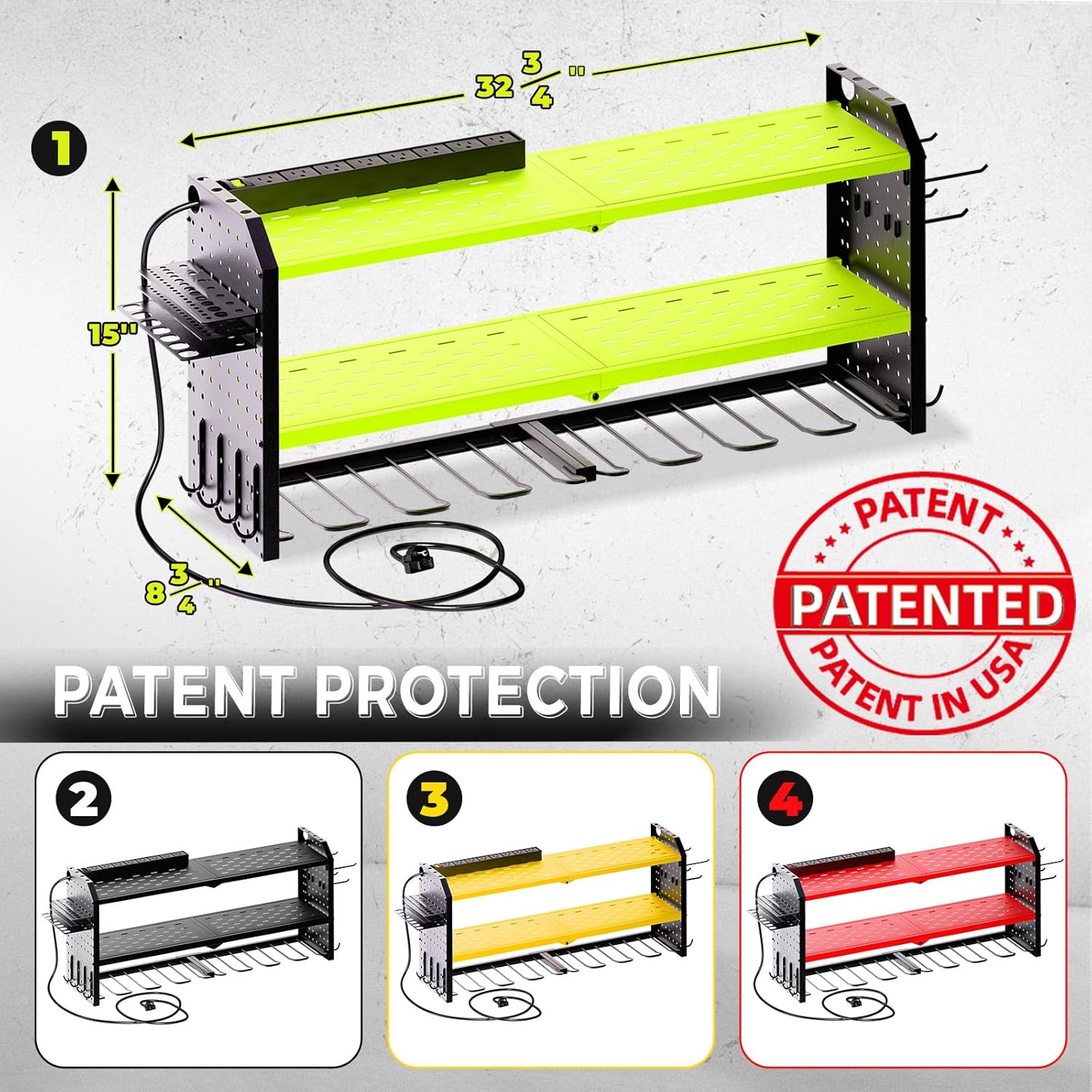 - Efficient Storage: The KAFAHOM Electric Tool Rack is designed with three tiers and eight dedicated slots to efficiently store your electric tools. The top tier features a built-in charging station, enabling direct charging while tools are stored.The power cord is 7 FT long 14AWG,and the charging station is 15A 125VAC 1875W 60Hz.