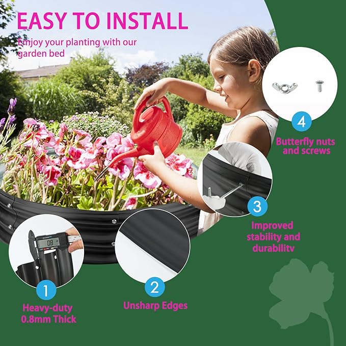 - 【EASY ASSEMBLY】: This galvanized steel raised garden bed only takes about 5 minutes to assemble easily,a screwdriver and a pair of gloves are need,which are prepared in the package already