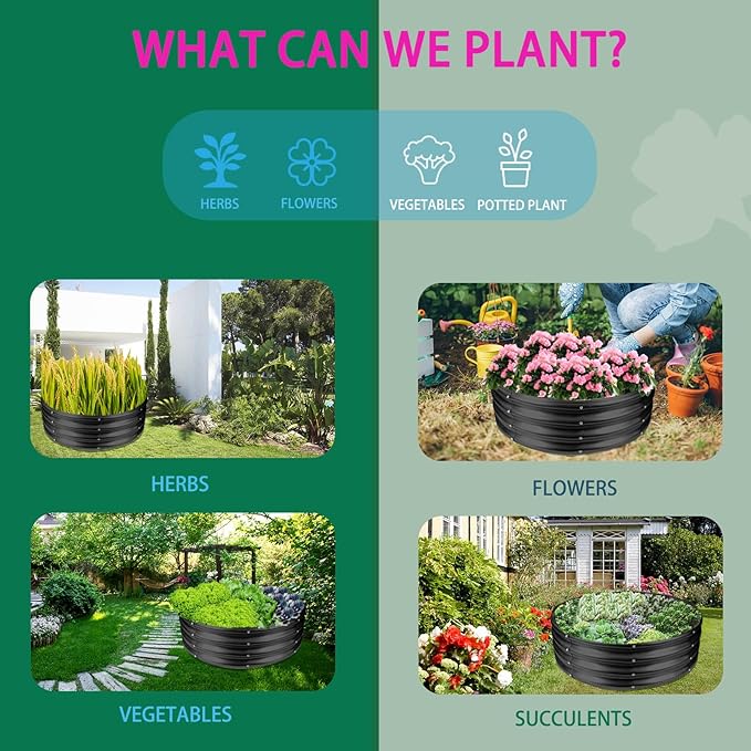 - 【STABLE】: This round raised garden bed is 32 IN Diameter,11.8 IN Tall, each is made of 0.8 MM thick Q195 galvanized metal sheet, double-layer anti-corrosion galvanizing and round structure design,it will provide a solid foundation for your plants