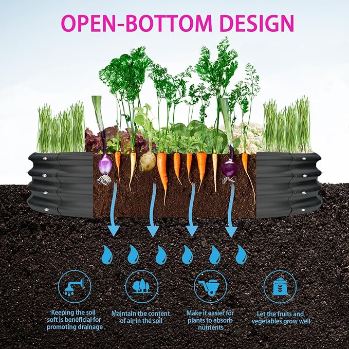 - 【OPEN BOTTOM】: This galvanized raised garden beds have open bottom design,which promotes healthy drainage and allows for deeper root growth, ensuring your plants thrive