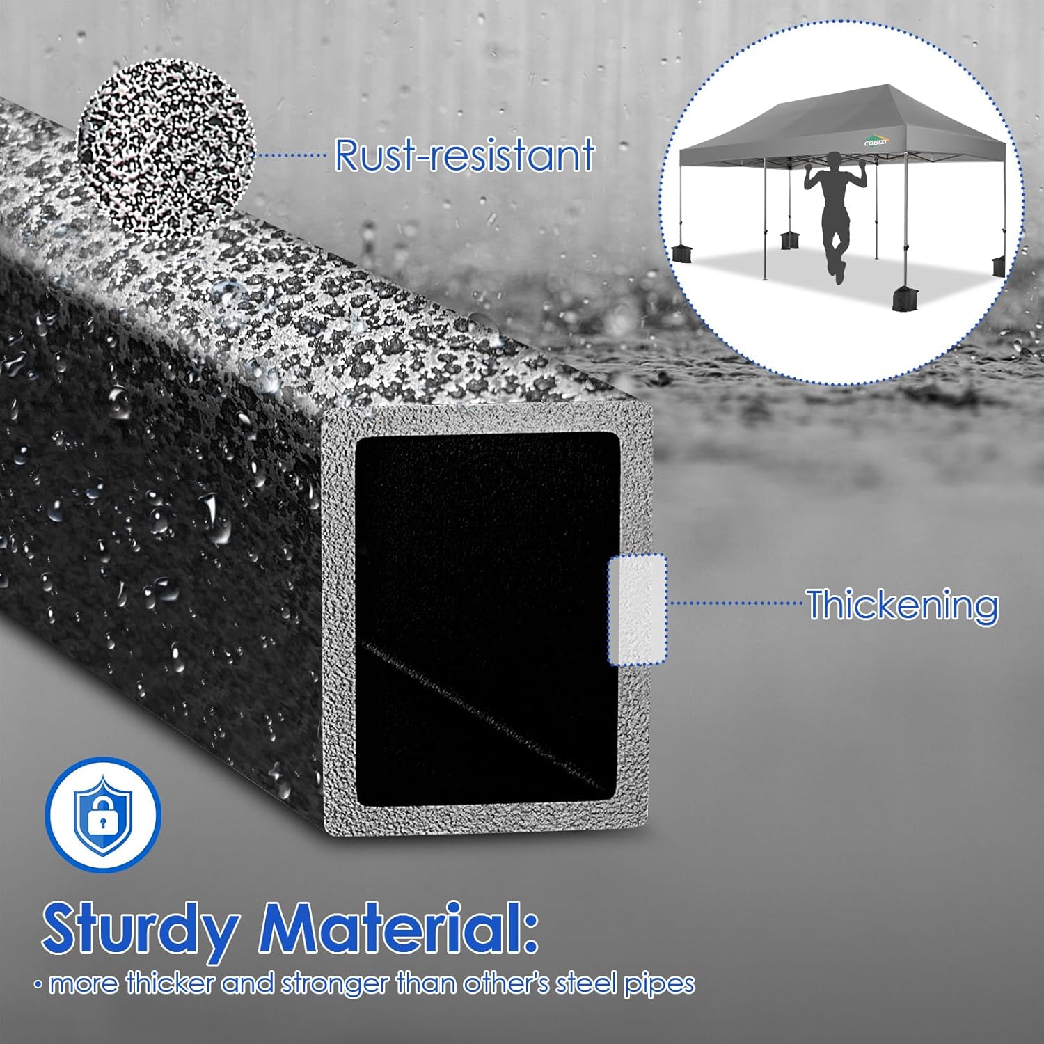 - ✦High Quality Frame Upgrade: High quality powder coated aluminum frame brings incredible strength to this heavy duty pop up canopy,at the same time rust and corrosion resistant. The newly upgraded 32mm steel tube diameter & 0.7mm wall thickness have significantly improved strength compared to other tents on the market and help to provide strong support, can carry up to the weight of 8 people at the same time. With sandbags and wind ropes,it can be stable in winds of 50 km/h.