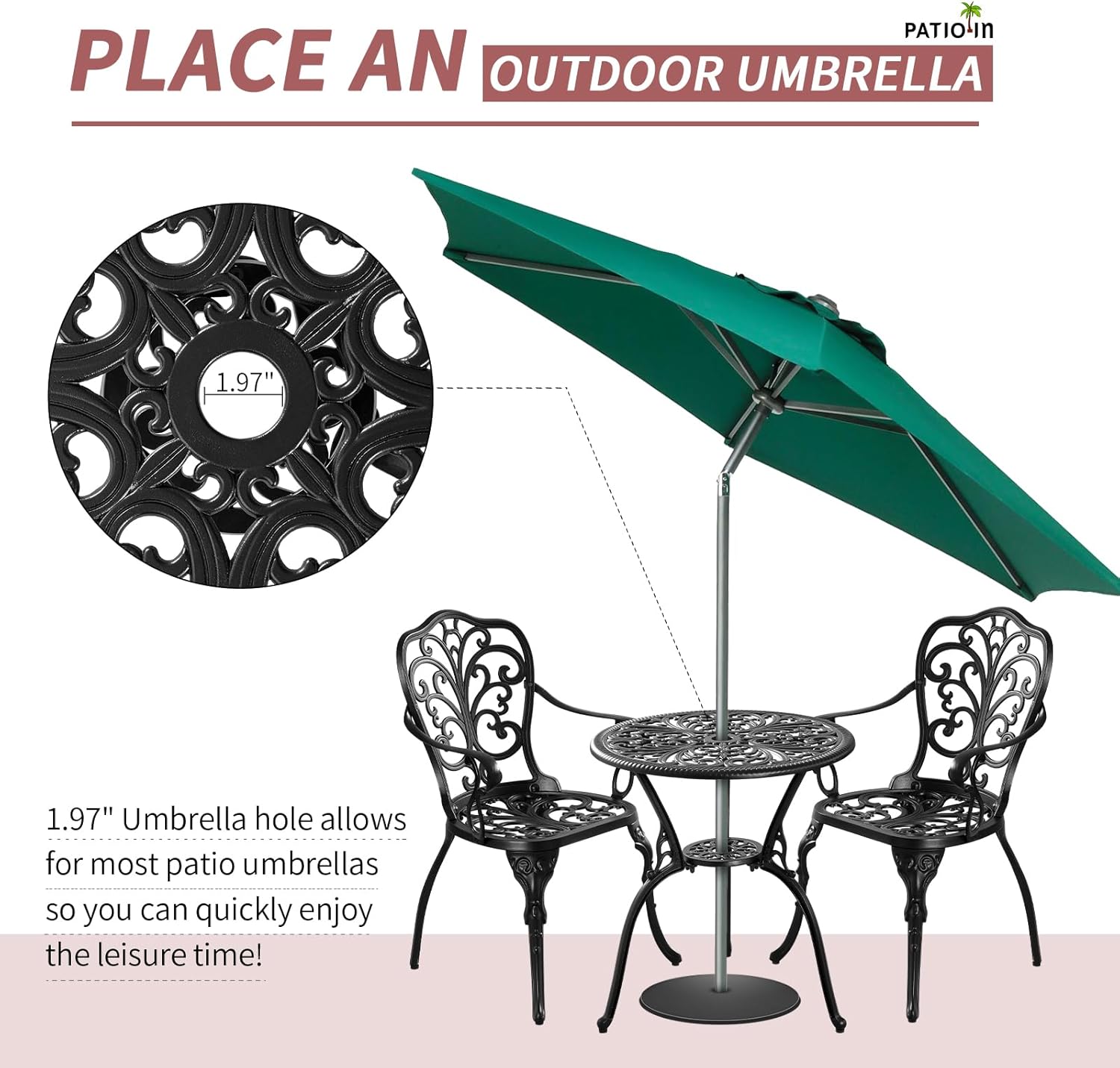 Outdoor Bistro Table and Chairs Set of 2, Outdoor Bistro Set 3 Piece with Umbrella Hole, Black Patio Bistro Sets Cast Aluminum for Balcony Porch Yard