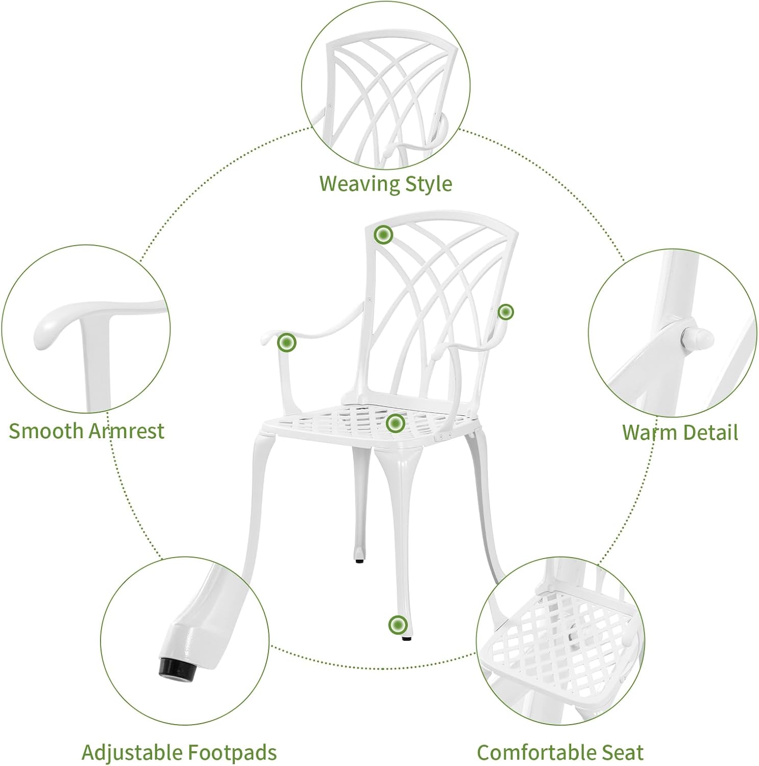 - Powder Coated Frame: The frame made of high-quality cast aluminum with powder coating protects the bistro set from getting rusty from all weather, and no fading and no aging ensure its durability for long time to come.