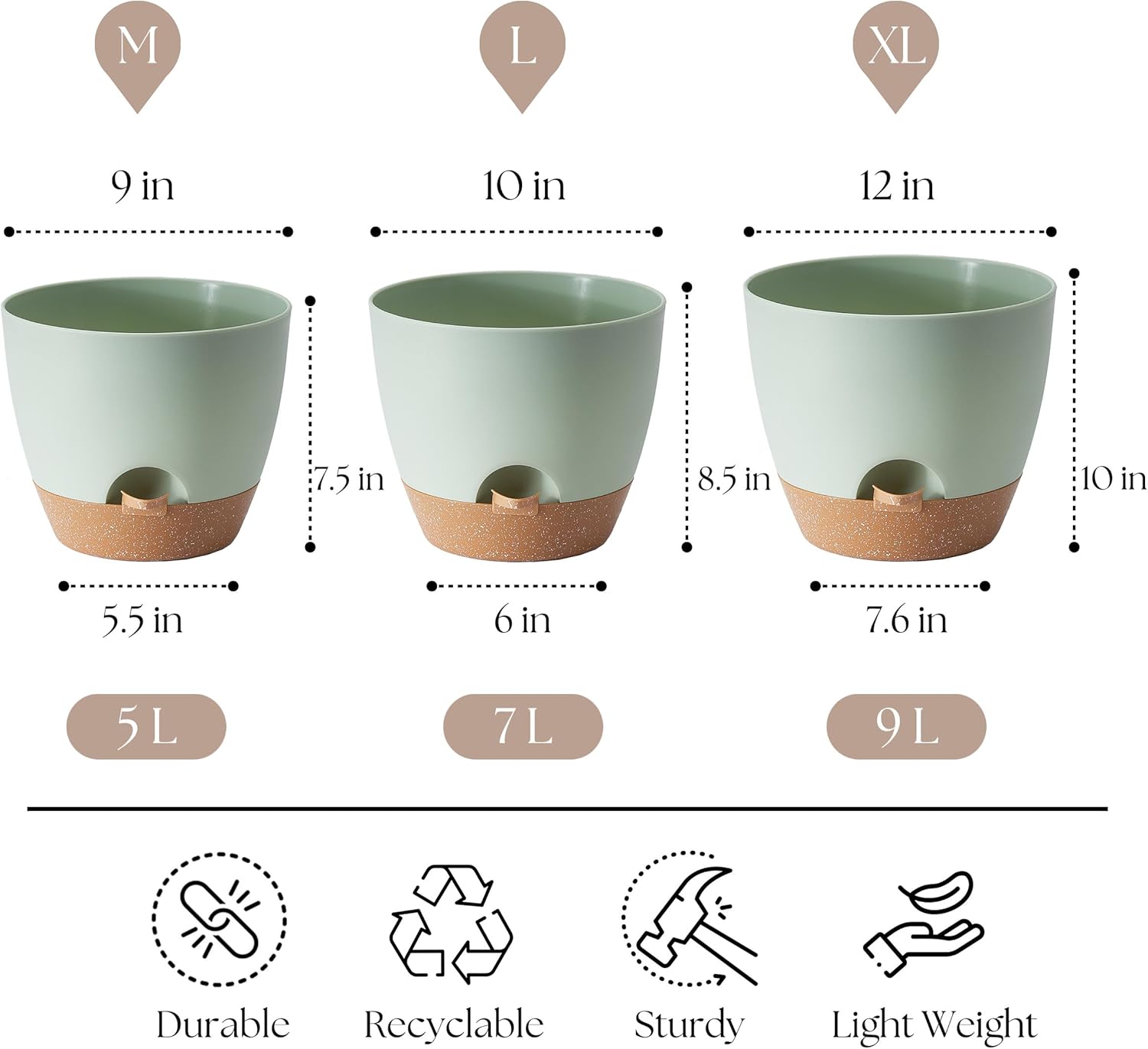 Plant Pots 12/10/9 inch Set of 3, Self Watering Flower Pots Indoor Outdoor, Planters with Drainage Hole Saucer Reservoir, Green