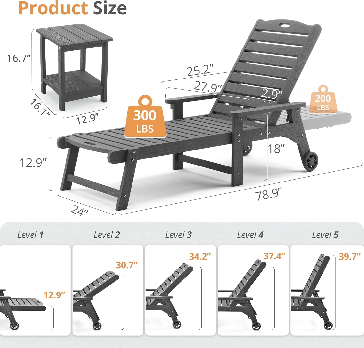 LUE BONA Chaise Lounge Chair with Table, 2-Piece,79'' Oversized HDPS Chaise Lounger, 5 Positions Adjustable Lounge Chairs, Pool Lounge Chair with Wheels for Poolside, 3 Year Warranty, Dark Gray