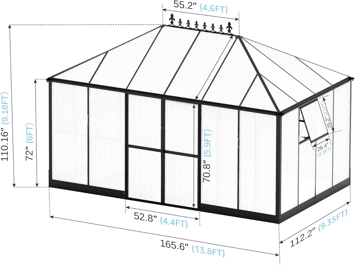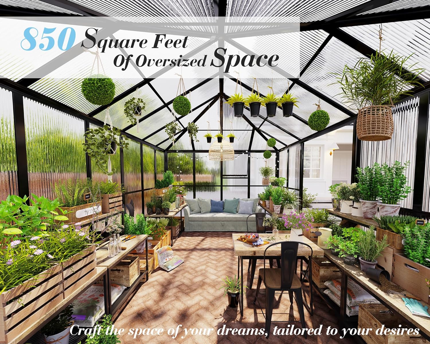 - 【Versatile Space】850 cu. Ft. to create a perfect warm environment for your personal plants. Transform your polycarbonate greenhouse into a functional living space by adding furniture. Exclusive design patent & a spear-like top discourages bird perching. Recommended to build a 15x10.5 FT foundation for it