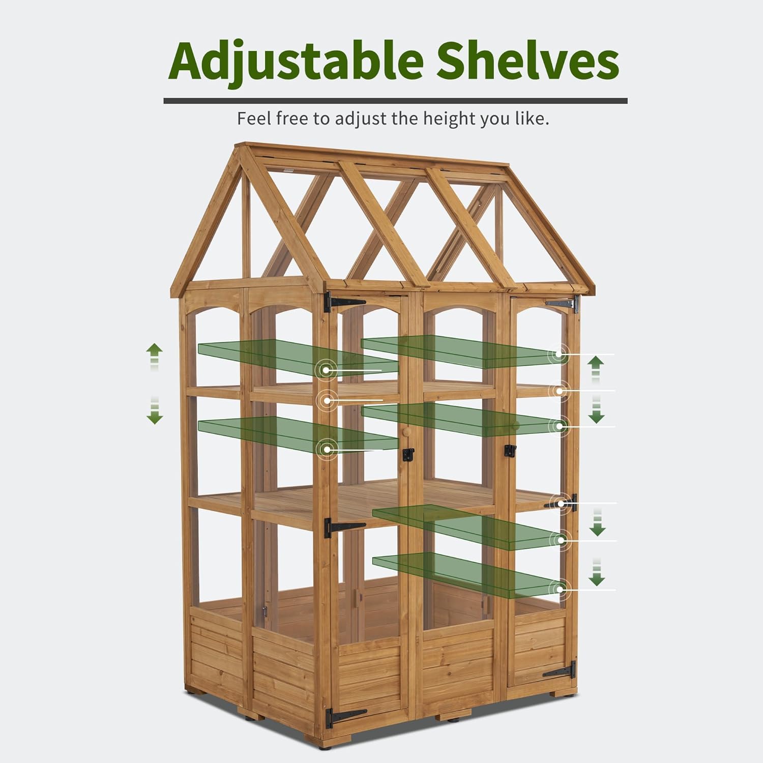 - Large Storage Space: This polycarbonate greenhouse has two-tier shelves that provide enough space to organize your plants and small planting tools. Three panels could adjust the height as you like