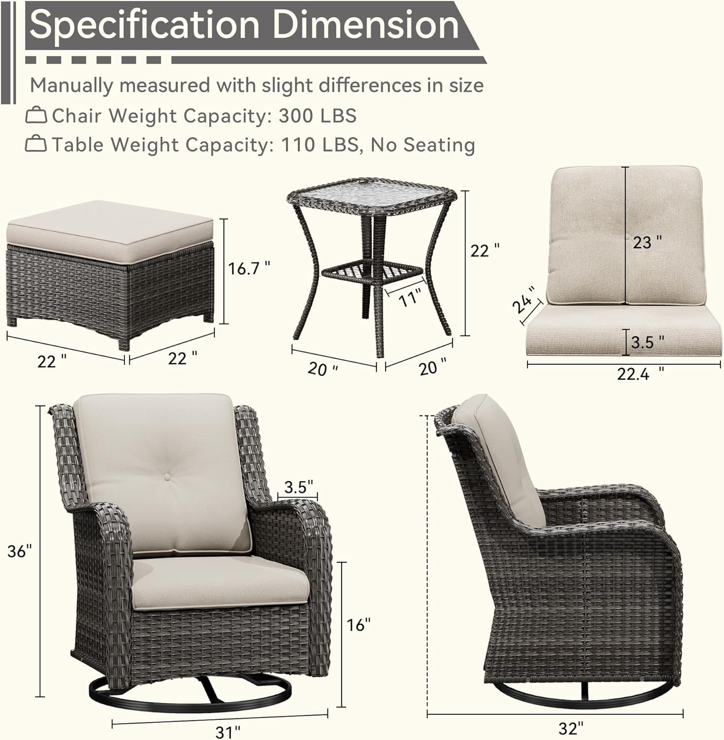 - [360° Swivel & Rocking] the two chairs can 360° swivel smoothly and rock back-and-forth to enjoy your leisure time to the fullest
