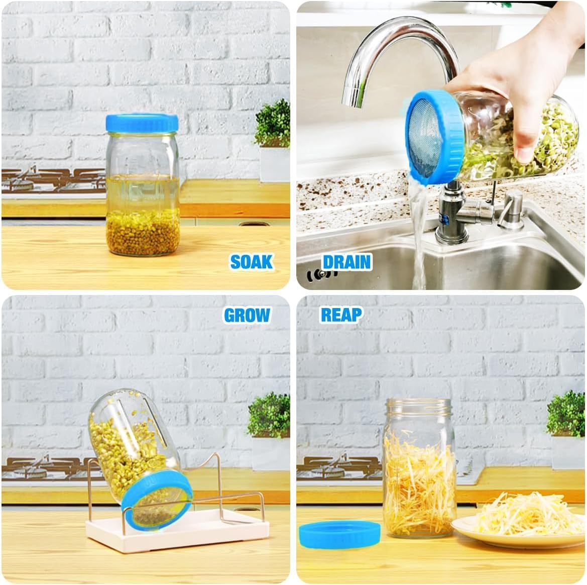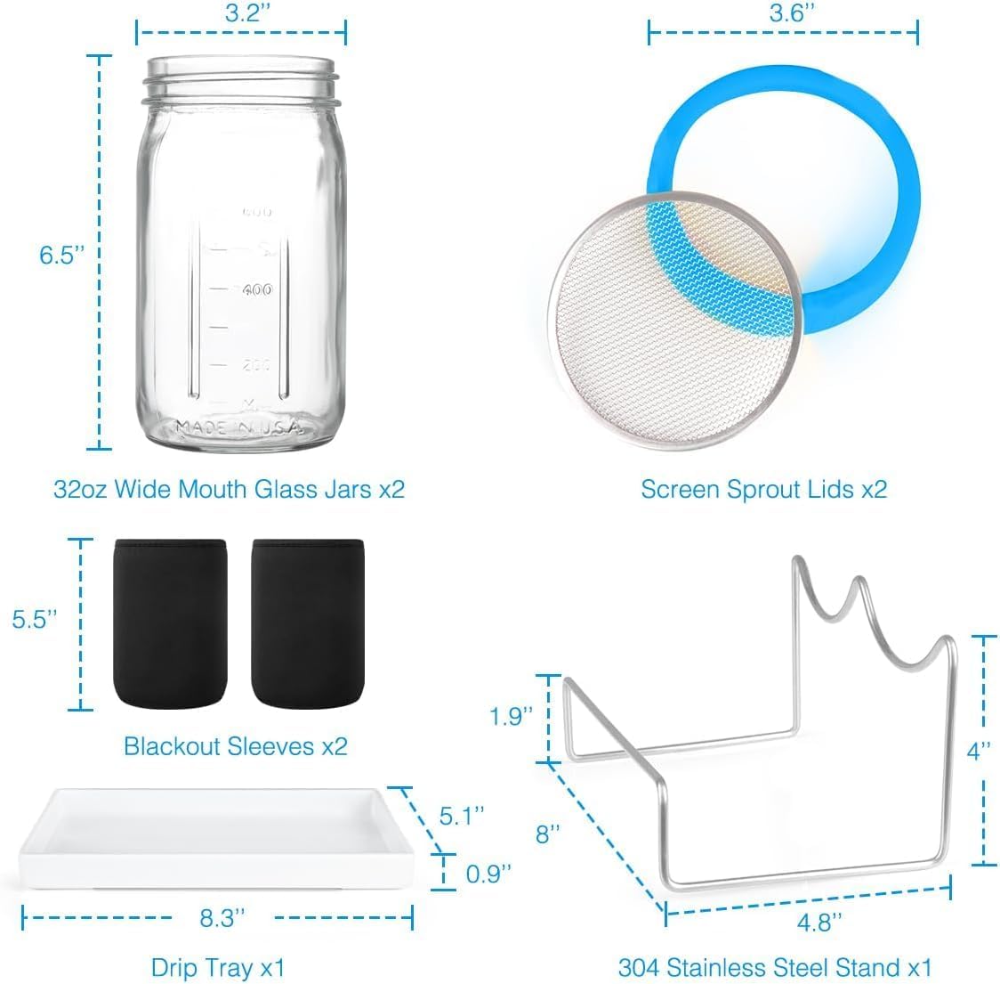 - COMPLETE SPROUTING KIT - Includes 2 Glass jars, 2 screen sprout lids, 1 stainless steel stand, 1 drip tray, 2 blackout sleeves.(SEED NOT INCLUDED)