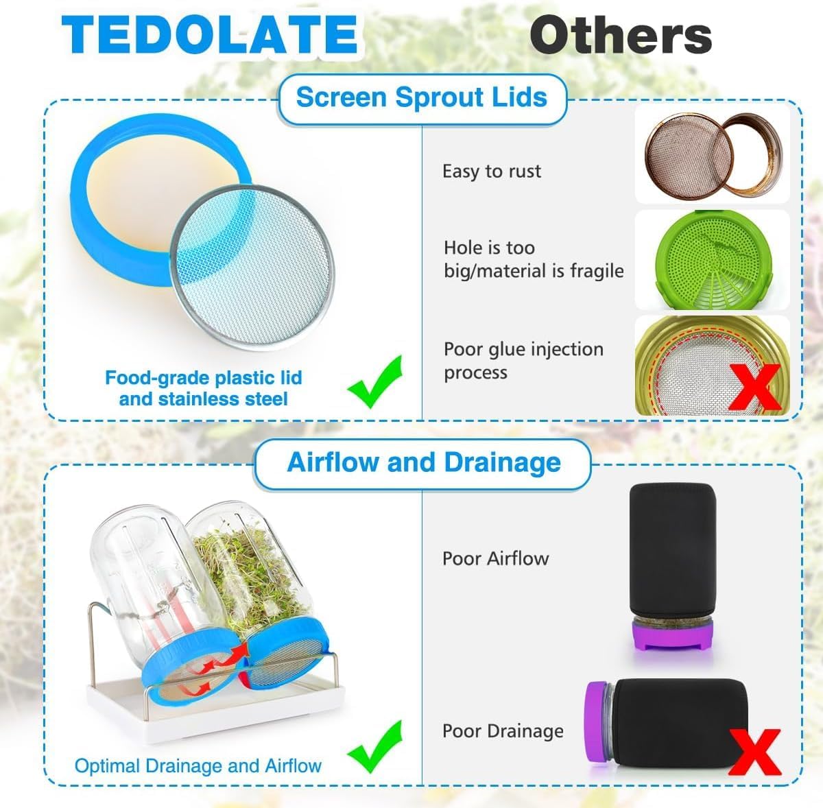 - MAKE SPROUT EASIER - Our sprouting stainless steel stand provides optimal drainage and airflow angles for jars, and keeps seeds&sprouts from rotting. Make your seeds sprout successfully every time, even a novice can sprout easily! Also, the shade sleeves will allow you to grow longer, straighter, and sweeter sprouts.
