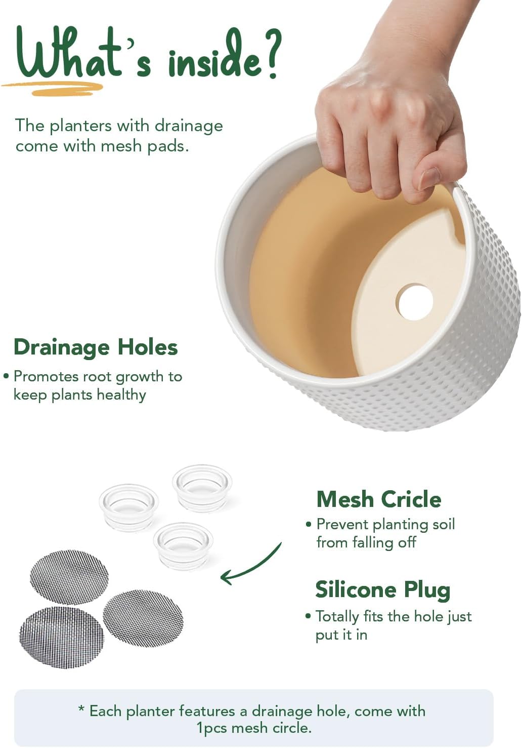 - Drainage Hole and Accessories: Each ceramic white pots for plants features carefully designed drainage hole to maintain optimal soil moisture; the inclusion of silicone plugs and mesh pads provides added convenience, giving you flexibility in how you care for your plants