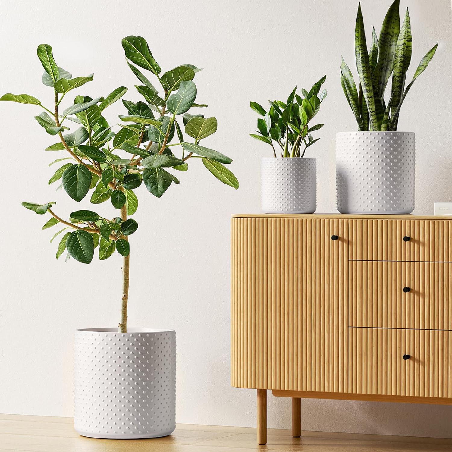 LE TAUCI Ceramic Plant Pots Indoor, 10+8+6 Inch Planters for Indoor Plants, Raised Dots Flower Pots with Drainage Hole and Plug, Cylinder Round Planters, Set of 3, White