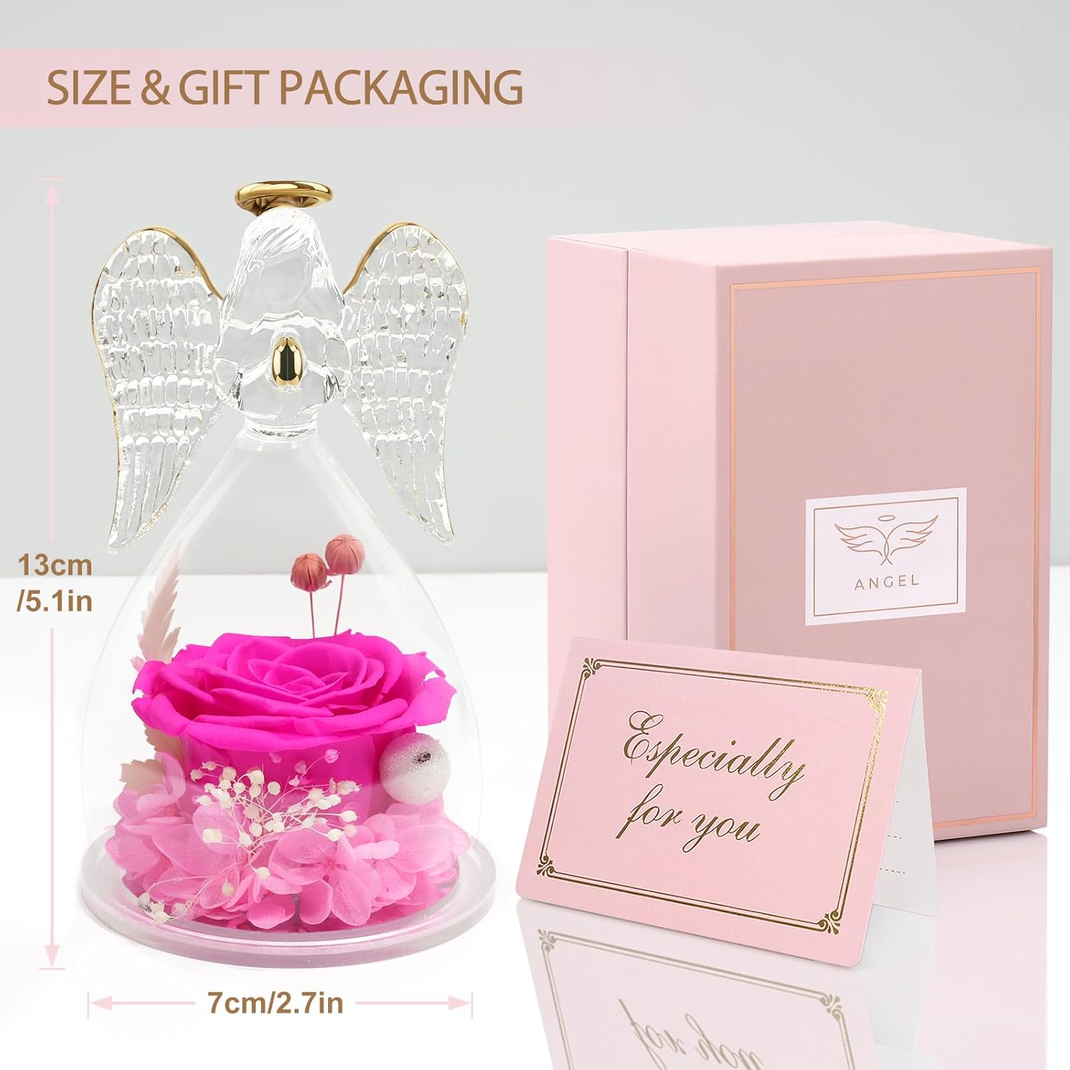 Yamonic Birthday Gifts for Mom,Christmas Angel Figurines with Real Rose Gifts for Her Mom Grandma,Preserved Flowers Rose Glass Angel Figurine for Mothers Day Christmas Birthday Gifts for Her(Hotpink)