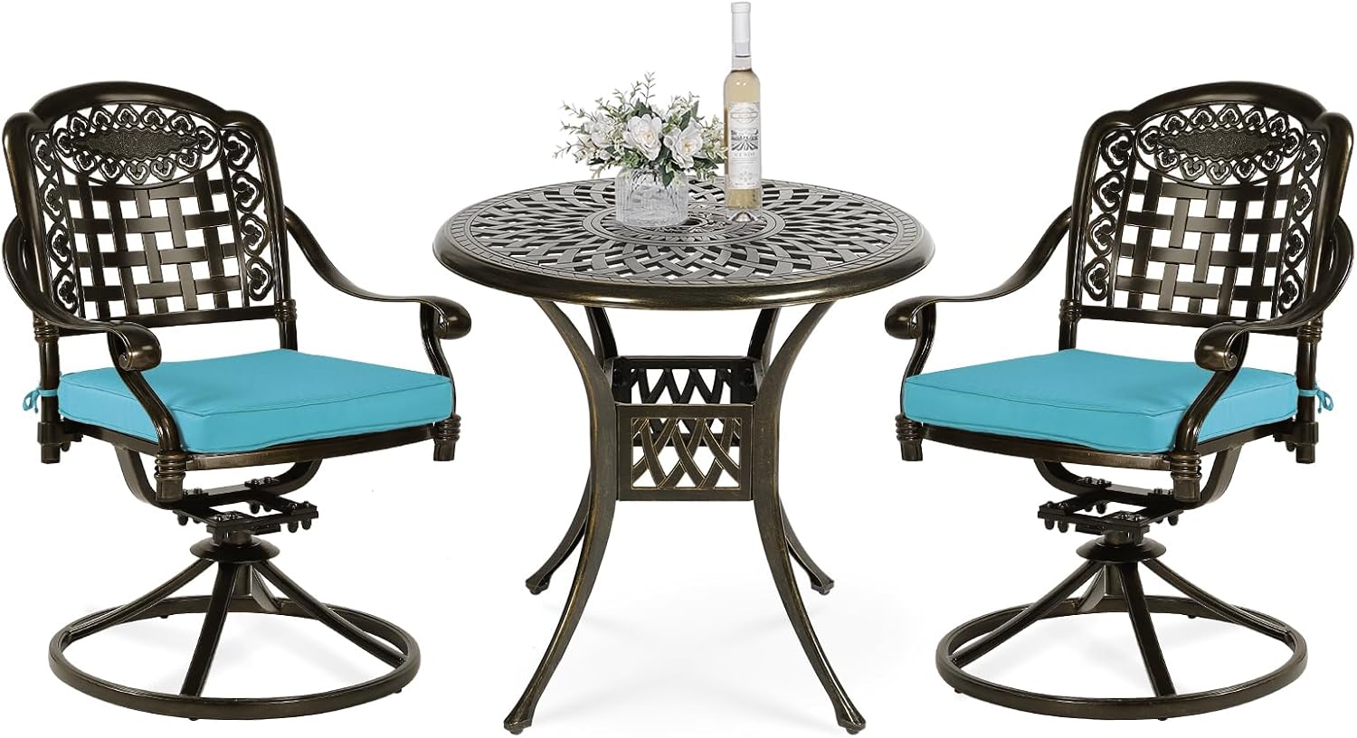 VIVIJASON 3-Piece Patio Bistro Set, Outdoor All-Weather Cast Aluminum Furniture Dining Set, Include 2 Swivel Chairs and 31" Round Table w/Umbrella Hole for Balcony, Lawn, Garden (Ocean Blue Cushion)
