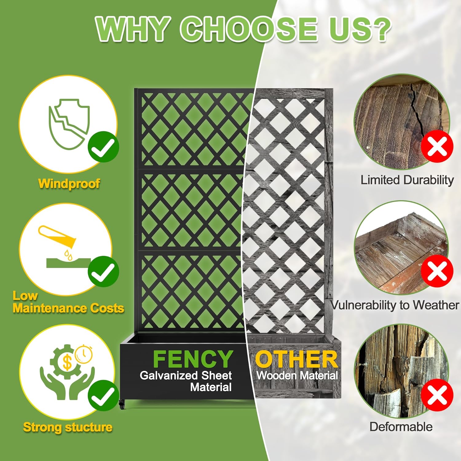 FENCY Metal Planter Box with Diamond Lattice Trellis Planter Box for Climbing Plants/Vines, Galvanized Raised Garden Bed On Wheels, Garden Bed with Trellis(73"x47" Black)